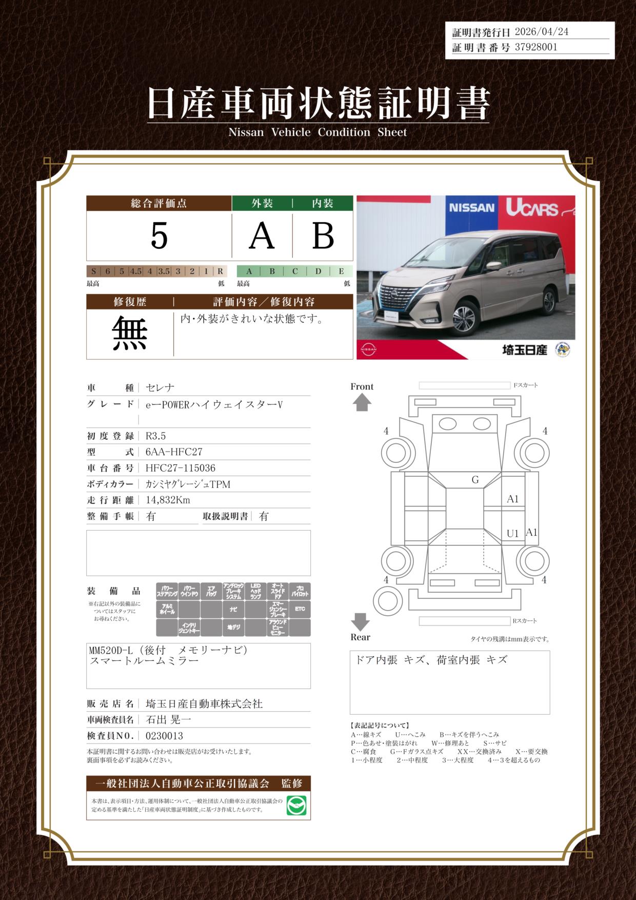 「車両状態証明書」は、査定協会監修のプロの検査員が公正かつ確かな基準で検査した”安心の証”です。