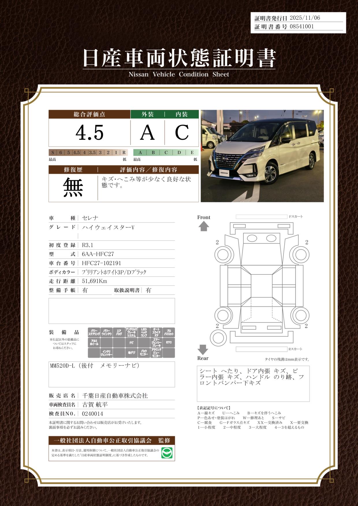 評価機関 : 日産車両状態証明