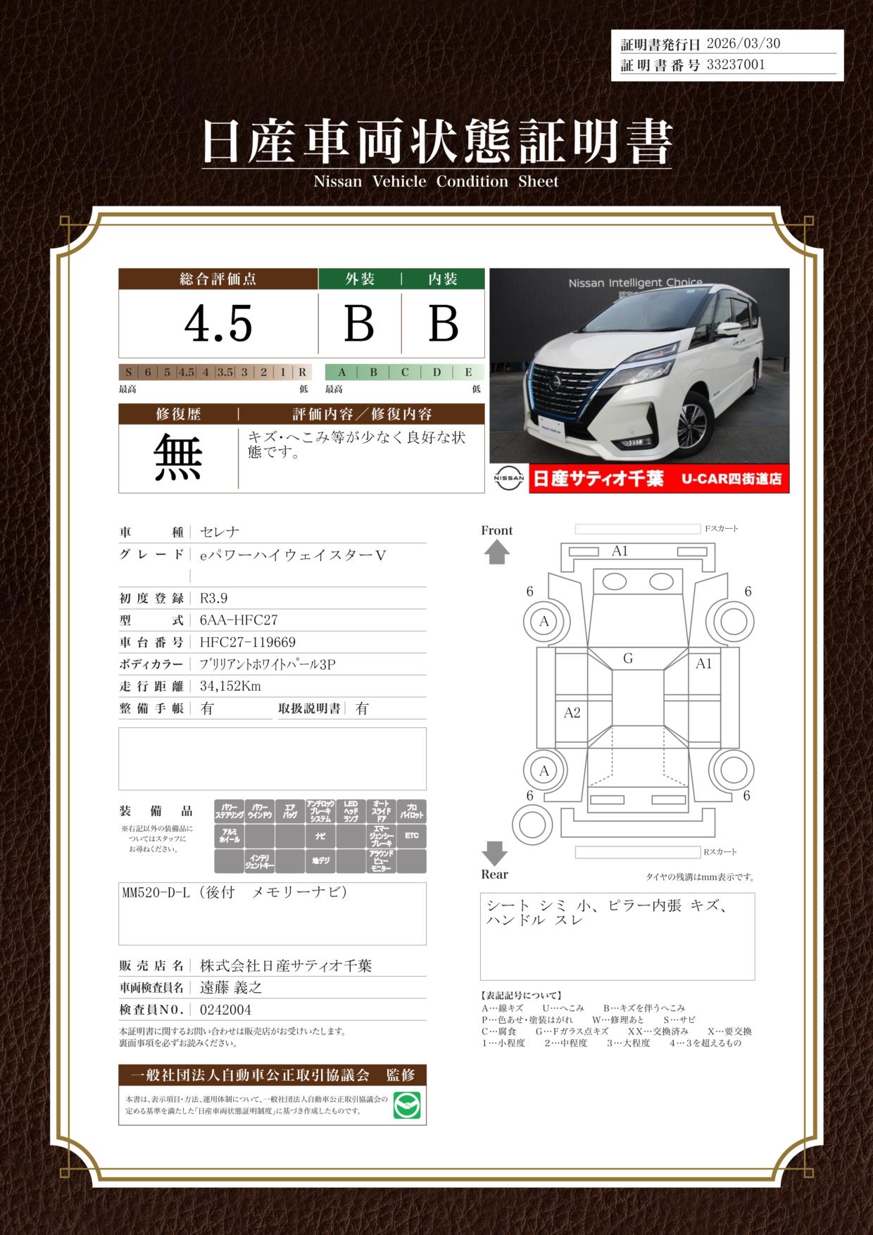 「車両状態証明書」は、査定協会監修のプロの検査員が公正かつ確かな基準で検査した”安心の証”です。