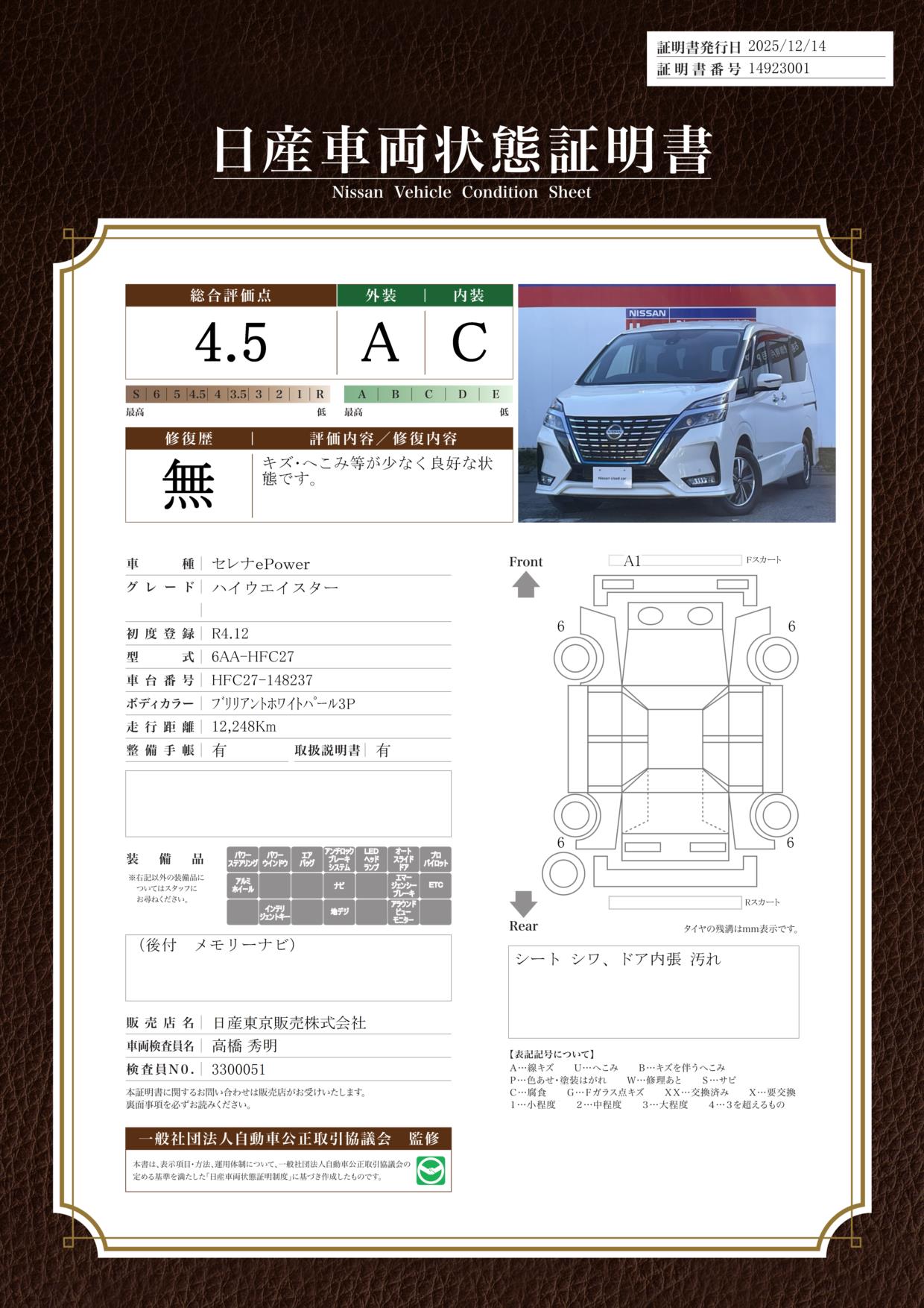 現状括弧書き内の年月まで車検有効期限が残っていますが、ご成約時に新しく車検を取り直します。なお取り直しの費用は車両価格に含まれています。