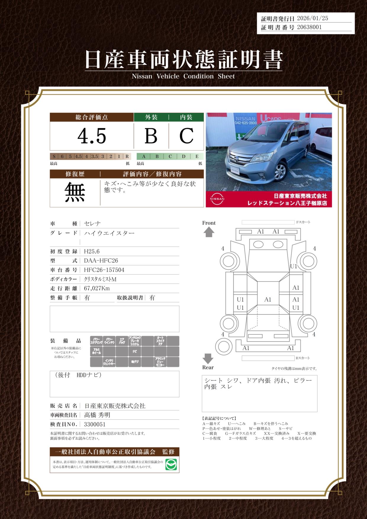 現状括弧書き内の年月まで車検有効期限が残っていますが、ご成約時に新しく車検を取り直します。なお取り直しの費用は車両価格に含まれています。