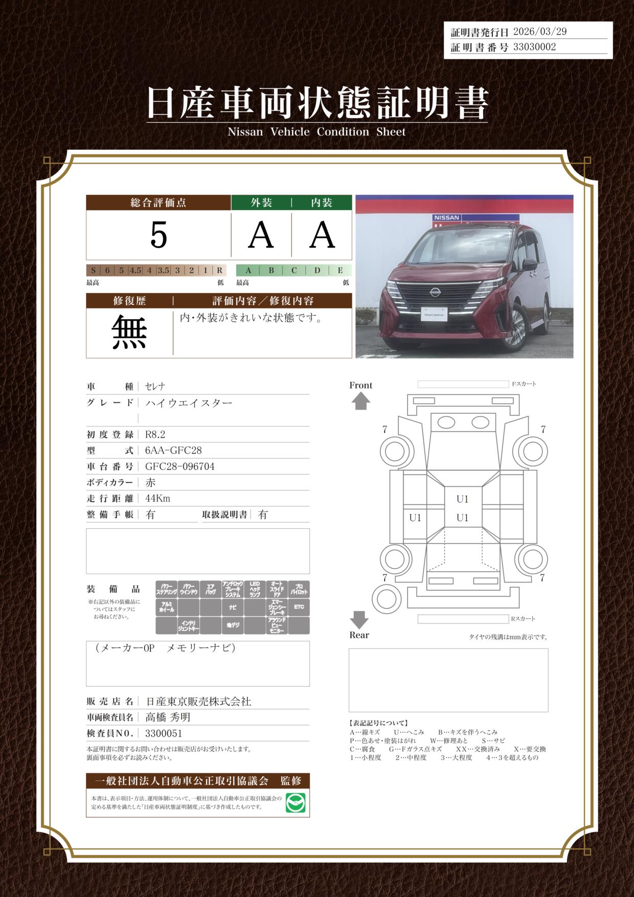 「車両状態証明書」は、査定協会監修のプロの検査員が公正かつ確かな基準で検査した”安心の証”です。