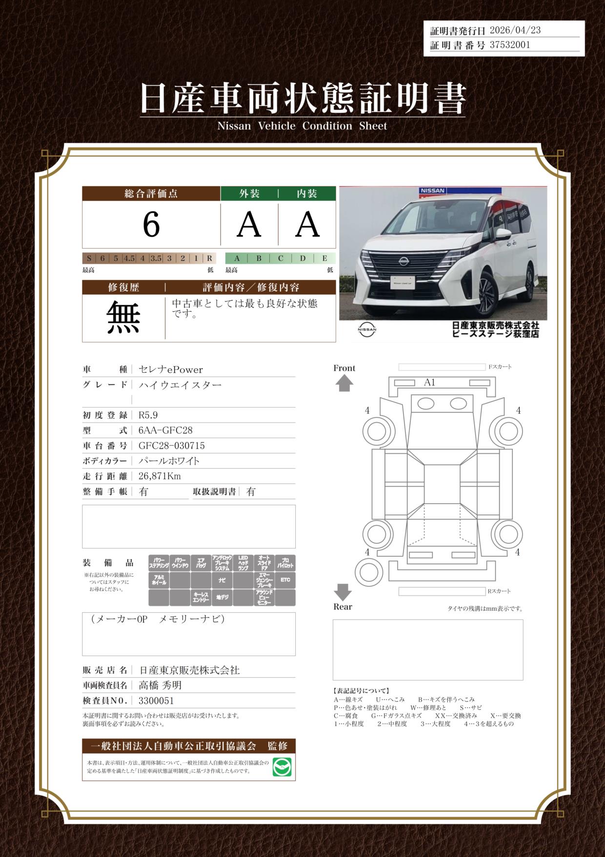 「車両状態証明書」は、査定協会監修のプロの検査員が公正かつ確かな基準で検査した”安心の証”です。