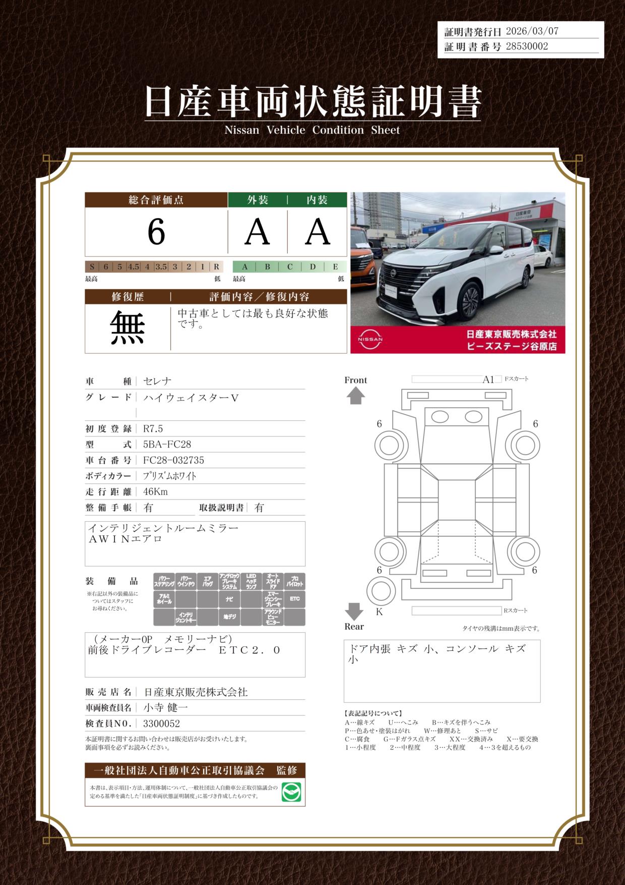 「車両状態証明書」は、査定協会監修のプロの検査員が公正かつ確かな基準で検査した”安心の証”です。