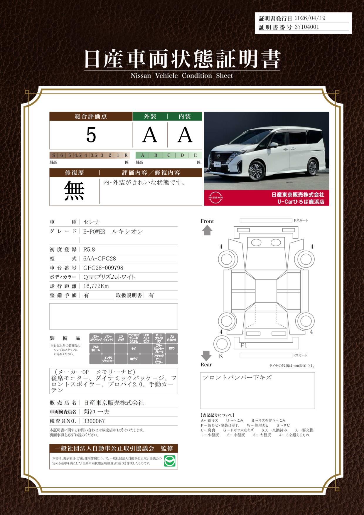「車両状態証明書」は、査定協会監修のプロの検査員が公正かつ確かな基準で検査した”安心の証”です。