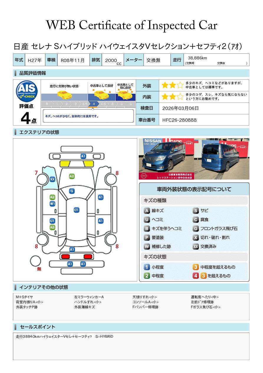 現状括弧書き内の年月まで車検有効期限が残っていますが、ご成約時に新しく車検を取り直します。なお取り直しの費用は車両価格に含まれています。