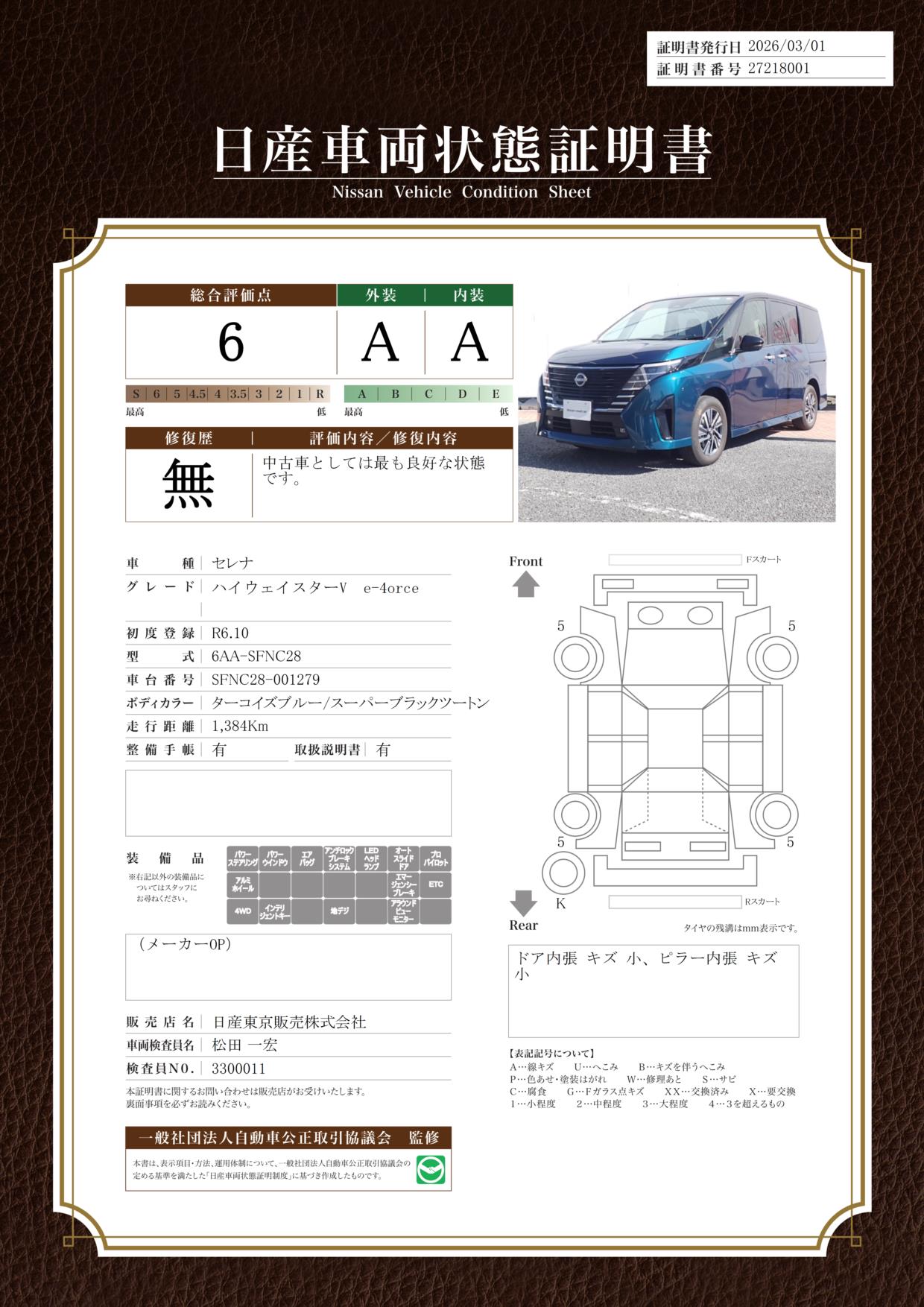 「車両状態証明書」は、査定協会監修のプロの検査員が公正かつ確かな基準で検査した”安心の証”です。