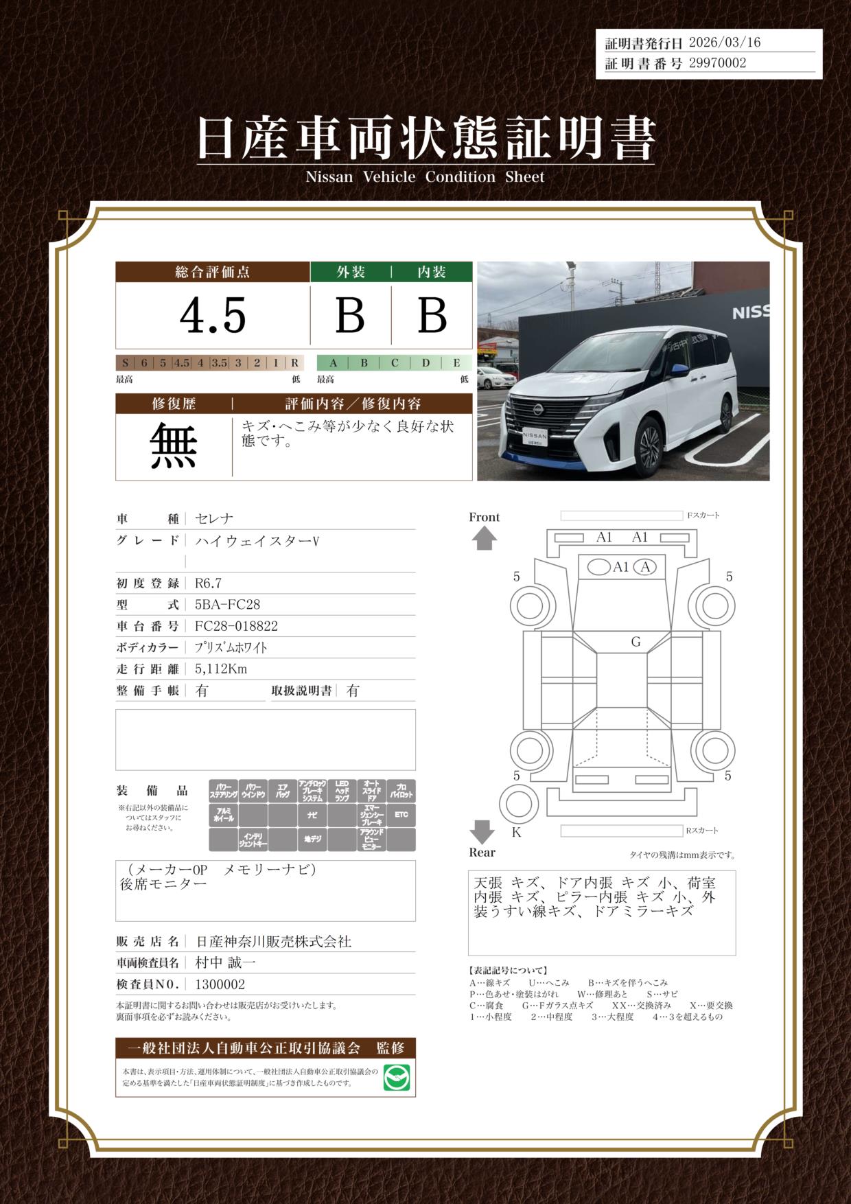「車両状態証明書」は、査定協会監修のプロの検査員が公正かつ確かな基準で検査した”安心の証”です。