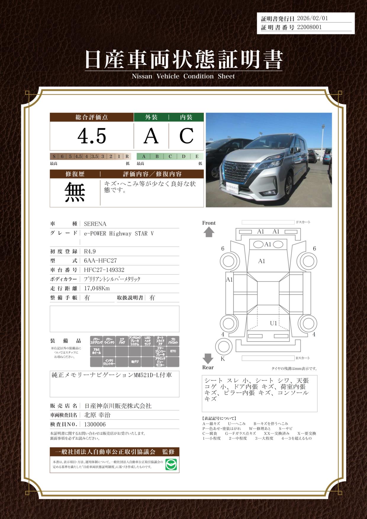 現状括弧書き内の年月まで車検有効期限が残っていますが、ご成約時に新しく車検を取り直します。なお取り直しの費用は車両価格に含まれています。