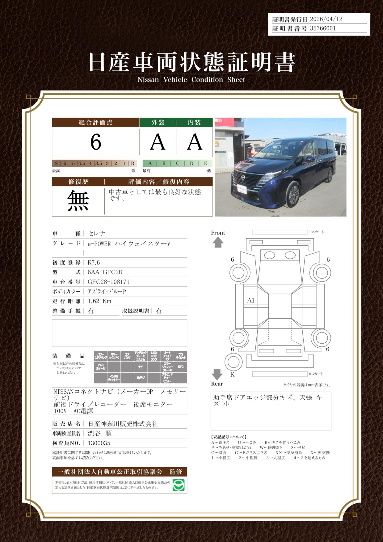 「車両状態証明書」は、査定協会監修のプロの検査員が公正かつ確かな基準で検査した”安心の証”です。
