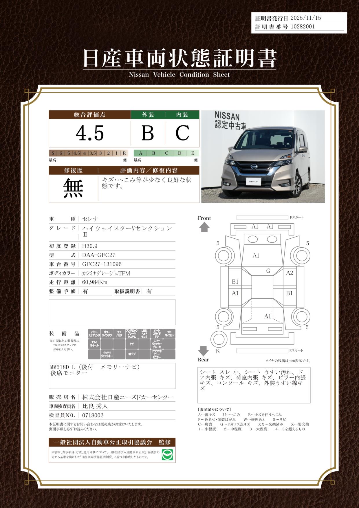 現状括弧書き内の年月まで車検有効期限が残っていますが、ご成約時に新しく車検を取り直します。なお取り直しの費用は車両価格に含まれています。