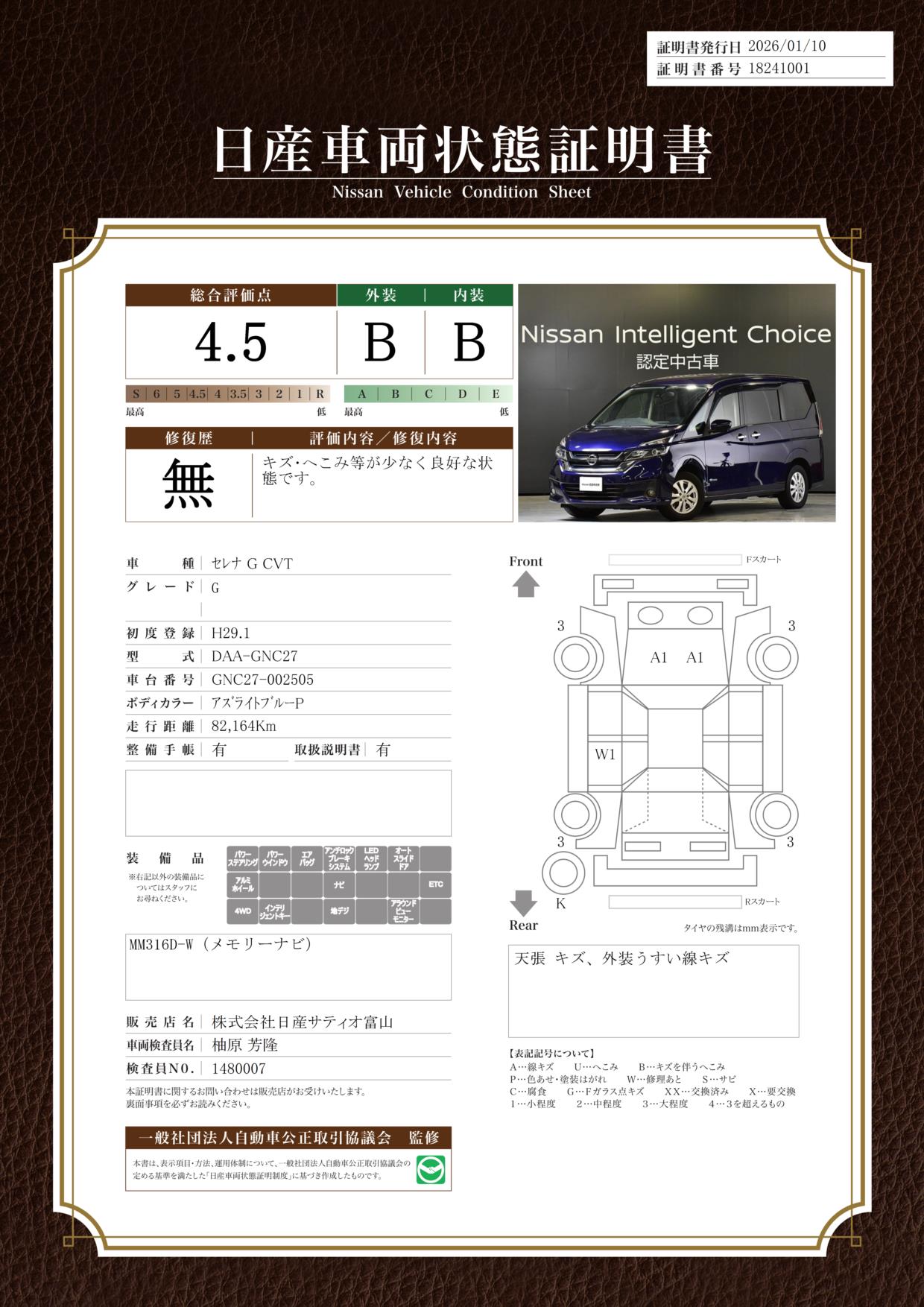 評価機関 : 日産車両状態証明