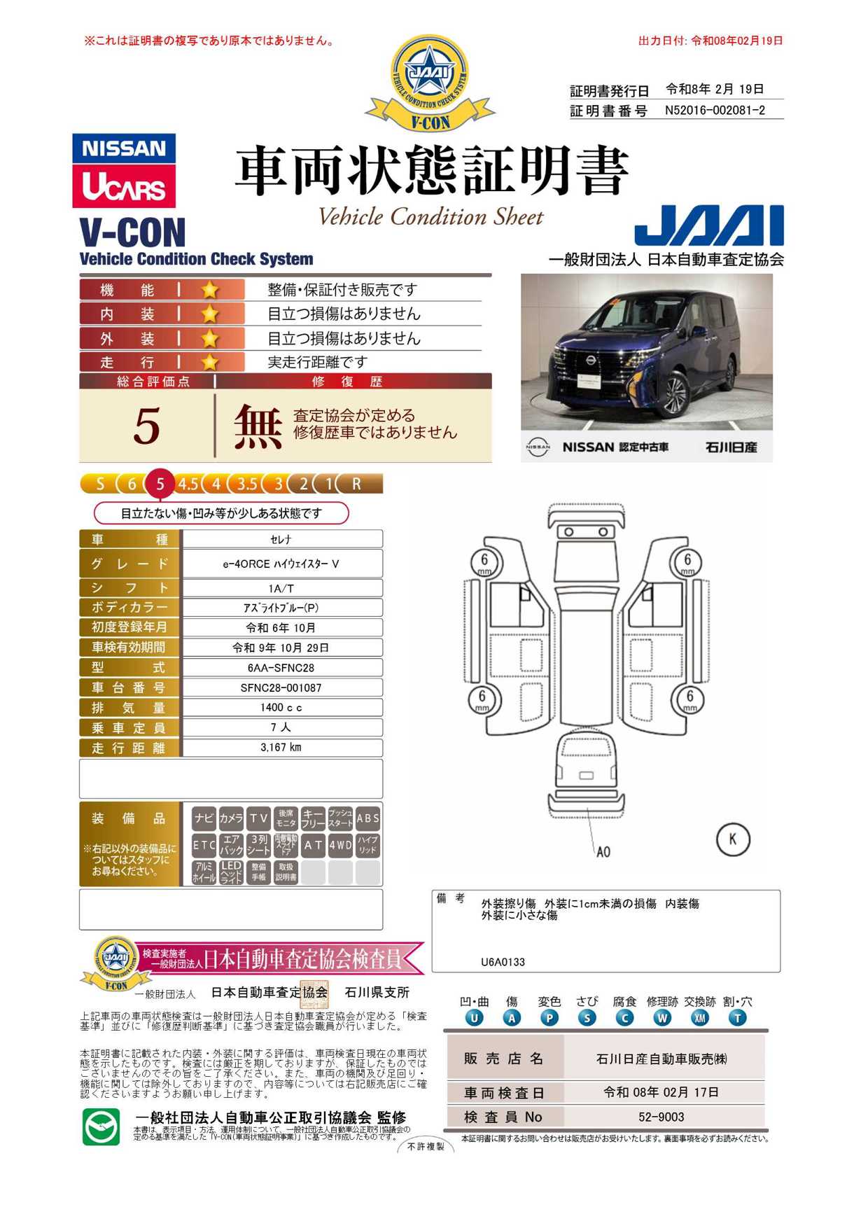 「車両状態証明書」は、査定協会監修のプロの検査員が公正かつ確かな基準で検査した”安心の証”です。