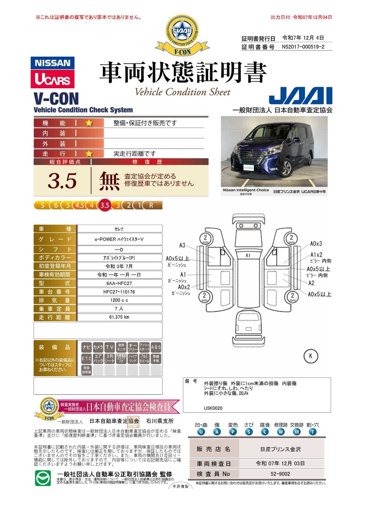 現状括弧書き内の年月まで車検有効期限が残っていますが、ご成約時に新しく車検を取り直します。なお取り直しの費用は車両価格に含まれています。