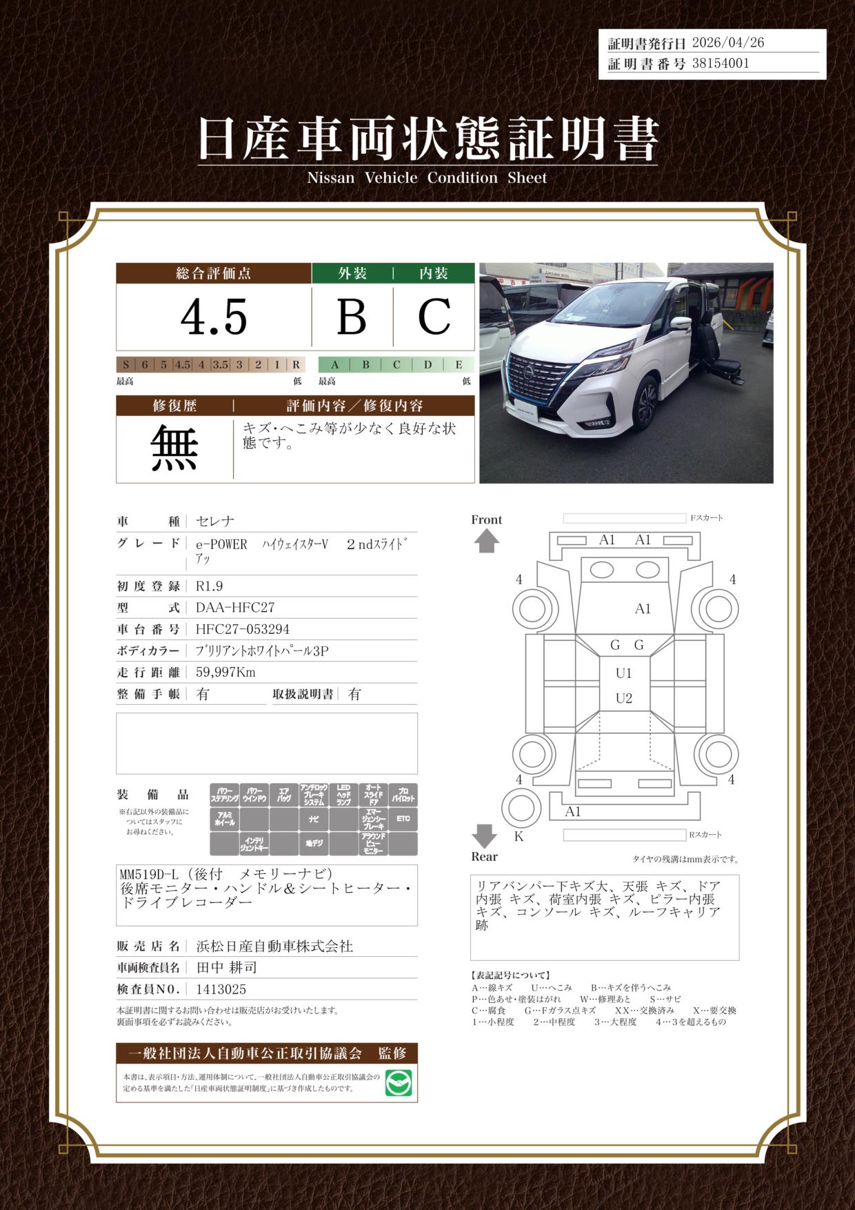 現状括弧書き内の年月まで車検有効期限が残っていますが、ご成約時に新しく車検を取り直します。なお取り直しの費用は車両価格に含まれています。