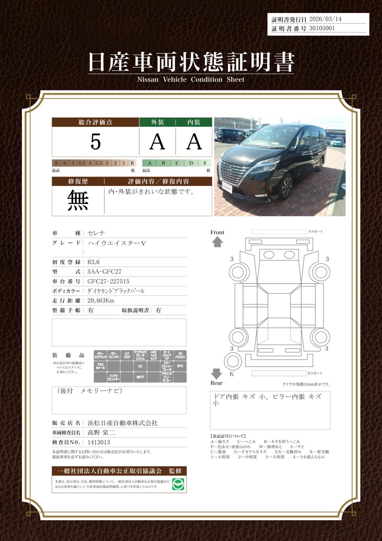「車両状態証明書」は、査定協会監修のプロの検査員が公正かつ確かな基準で検査した”安心の証”です。