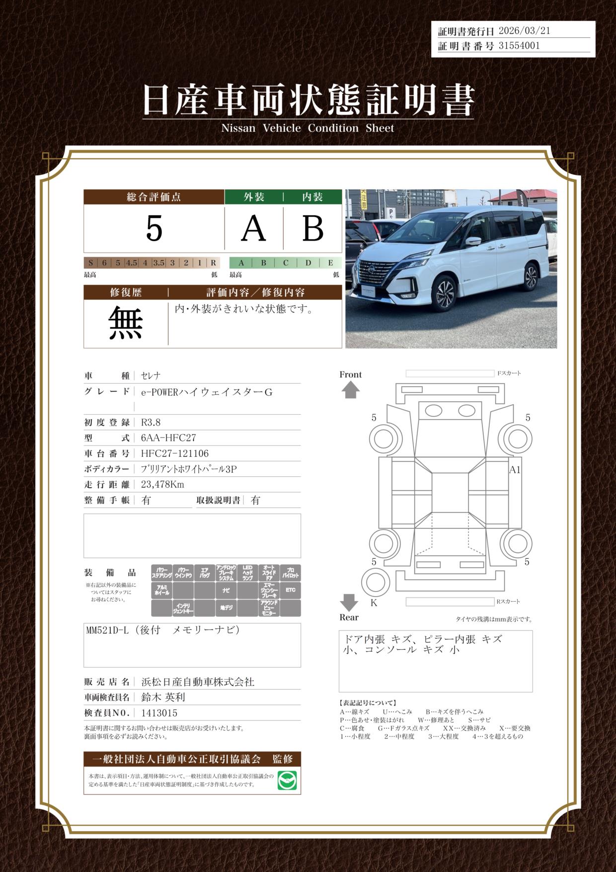 「車両状態証明書」は、査定協会監修のプロの検査員が公正かつ確かな基準で検査した”安心の証”です。
