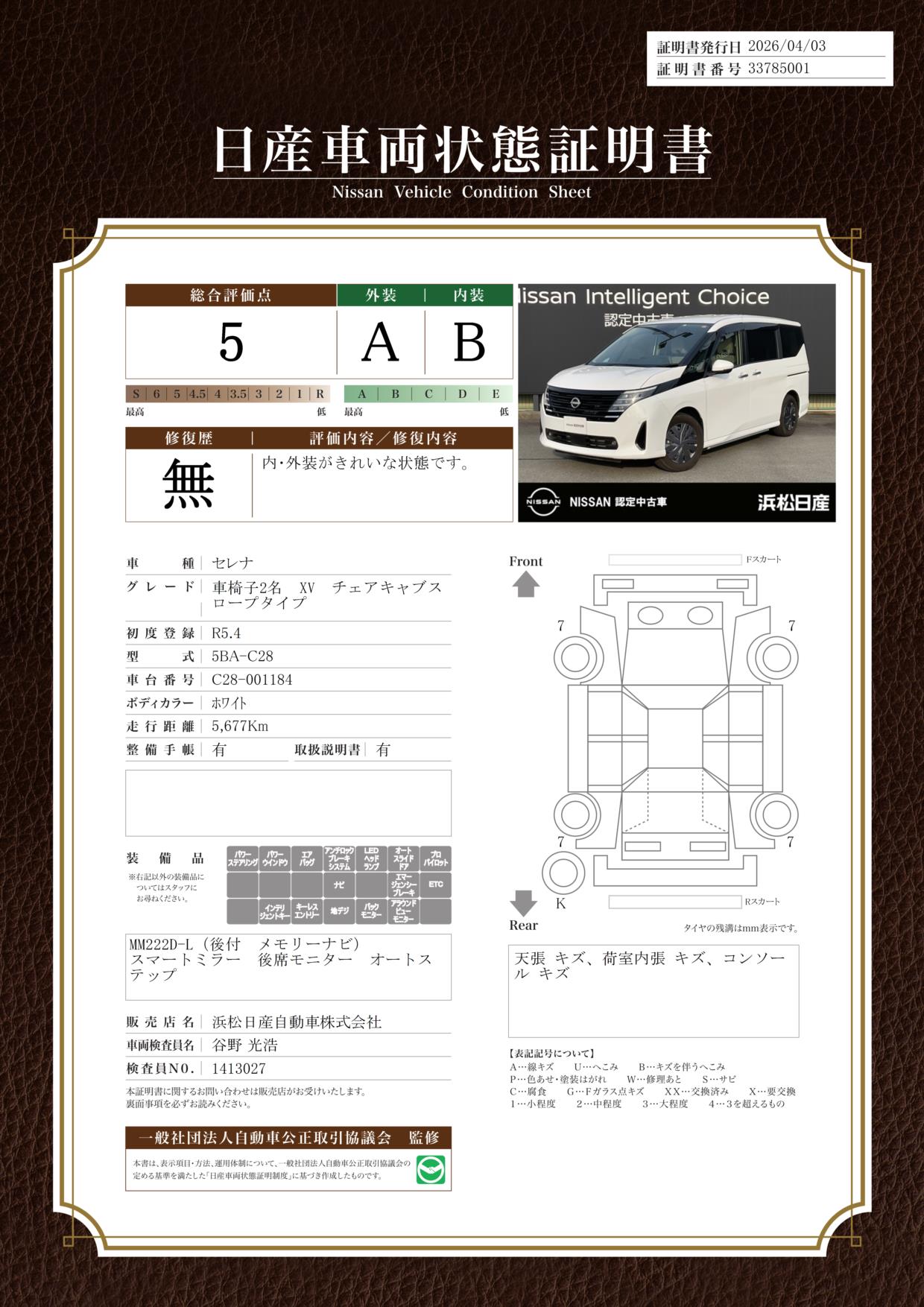 「車両状態証明書」は、査定協会監修のプロの検査員が公正かつ確かな基準で検査した”安心の証”です。