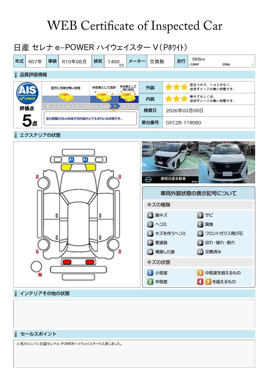 人気のミニバン日産セレナe-POWERハイウェイスターV入荷しました。当社試乗車で使用していた車両です。同県内で長くお付き合い頂ける方に乗って頂きたい1台です。