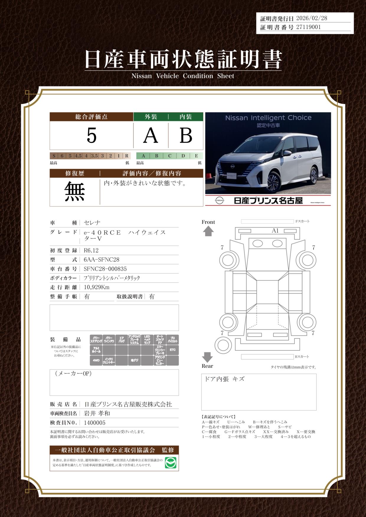 「車両状態証明書」は、査定協会監修のプロの検査員が公正かつ確かな基準で検査した”安心の証”です。
