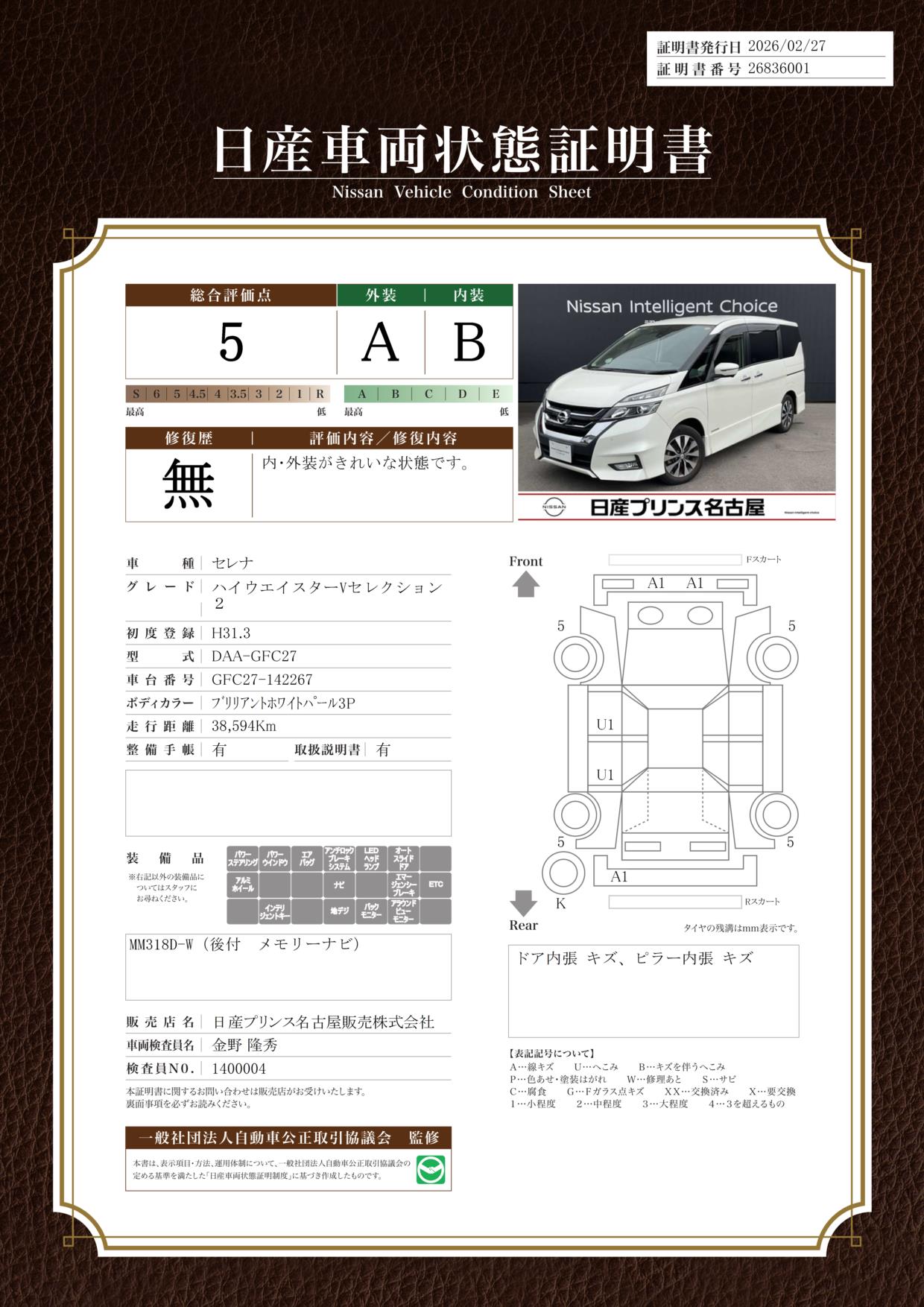 現状括弧書き内の年月まで車検有効期限が残っていますが、ご成約時に新しく車検を取り直します。なお取り直しの費用は車両価格に含まれています。