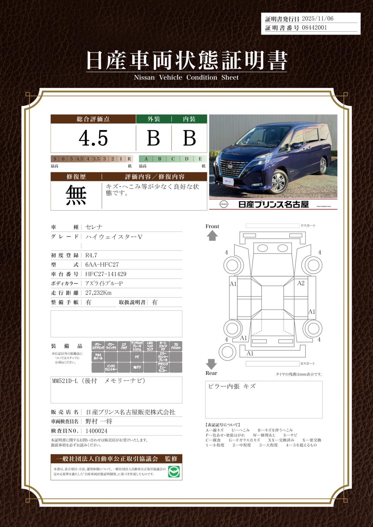 現状括弧書き内の年月まで車検有効期限が残っていますが、ご成約時に新しく車検を取り直します。なお取り直しの費用は車両価格に含まれています。