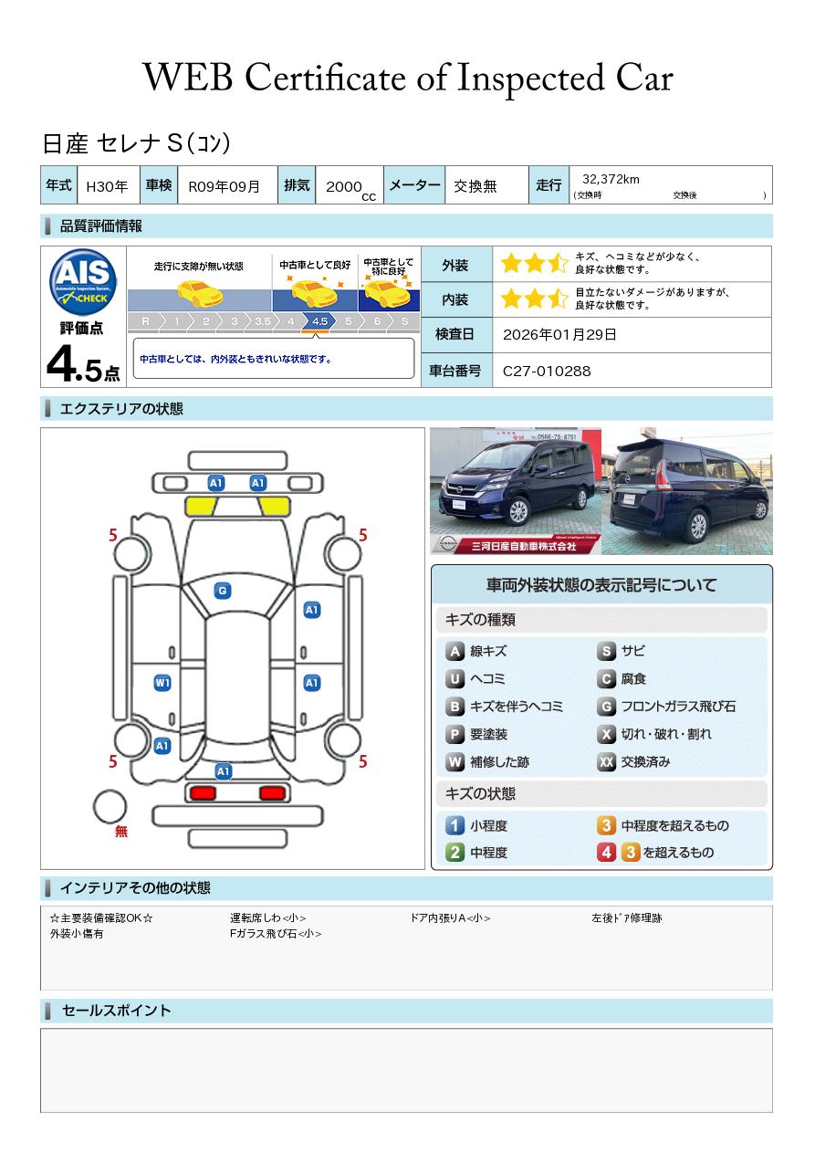 評価点イメージ : 中古車としては、内外装ともきれいな状態です。