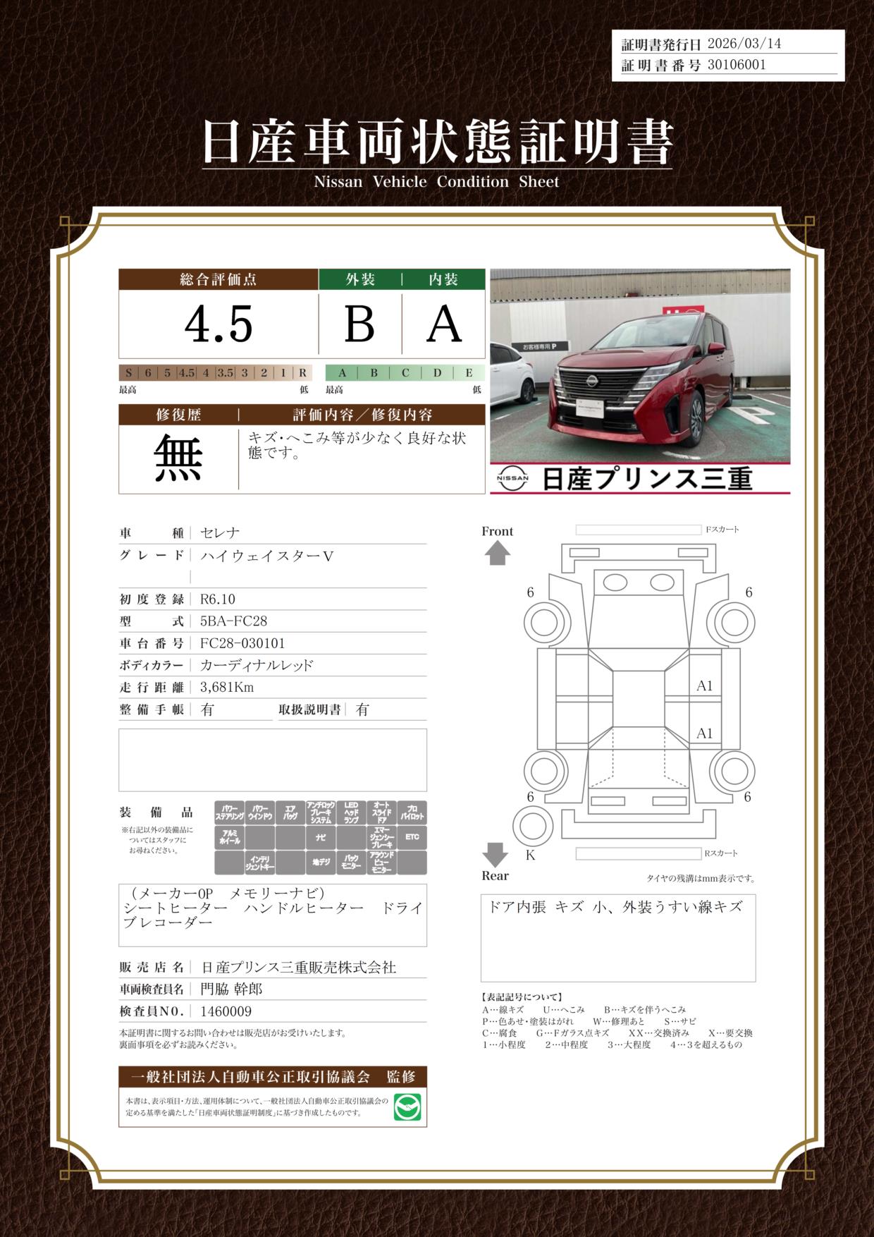 「車両状態証明書」は、査定協会監修のプロの検査員が公正かつ確かな基準で検査した”安心の証”です。