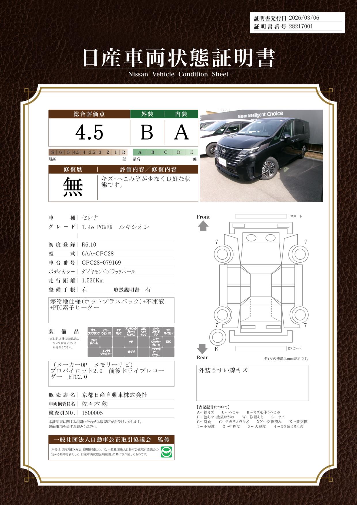 「車両状態証明書」は、査定協会監修のプロの検査員が公正かつ確かな基準で検査した”安心の証”です。
