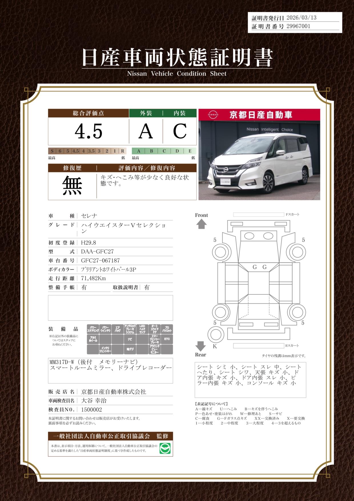 プロパイロットナビ全方位カメラドラレコETCワンオーナー当店では、ご安心頂く為に、ご来店頂きお車のご確認をおススメしております。