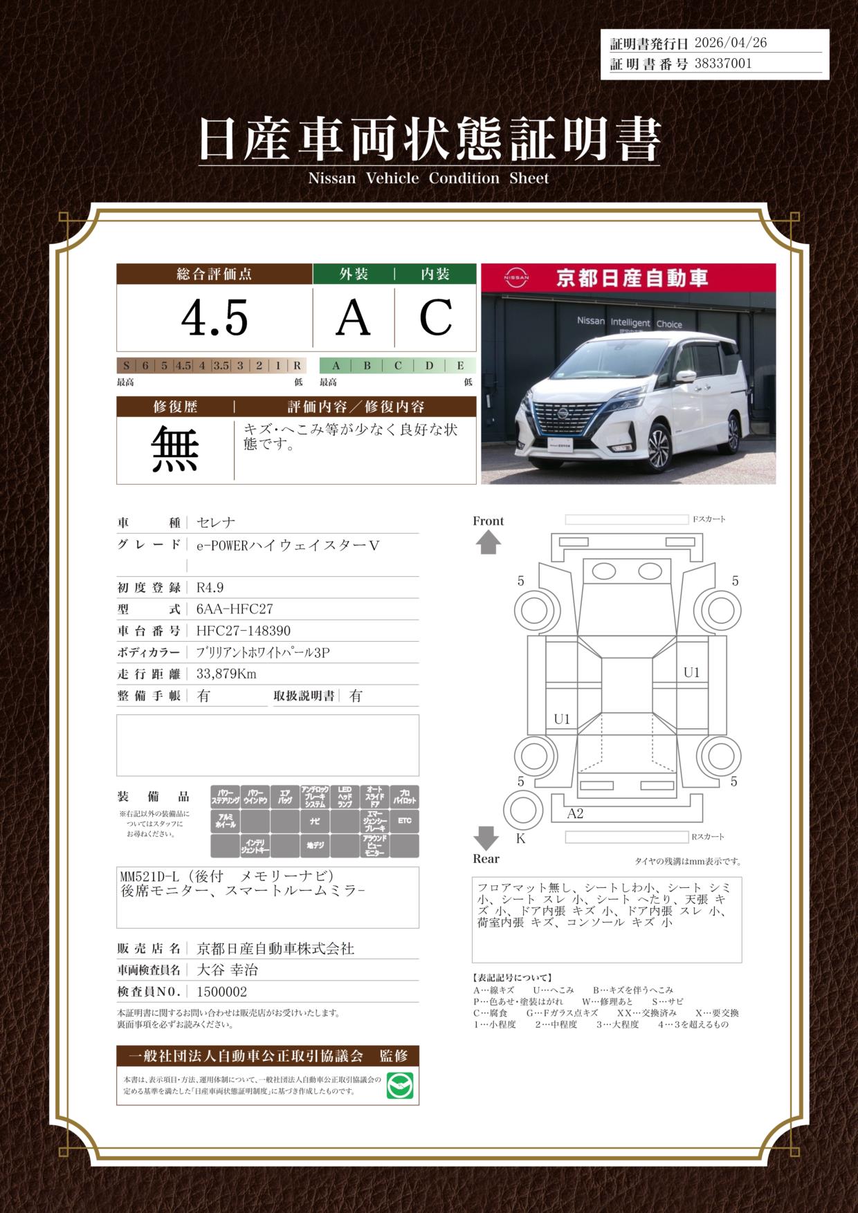 「車両状態証明書」は、査定協会監修のプロの検査員が公正かつ確かな基準で検査した”安心の証”です。