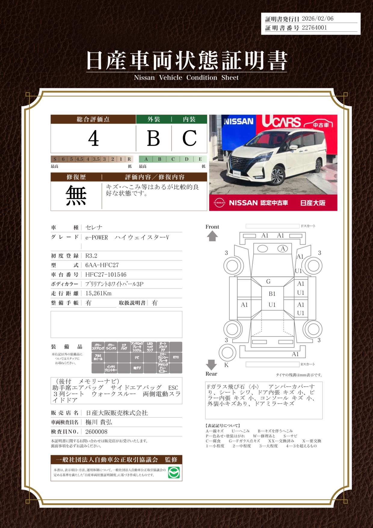 日産大阪UCARS枚方『日産中古車ワイド保証12ケ月』:延長保証もございます。後席モニタ・左右ハンズフリーA・アラウンド&10ワイドナビTV・スマートミラー・前後ドラレコ・純正16AW