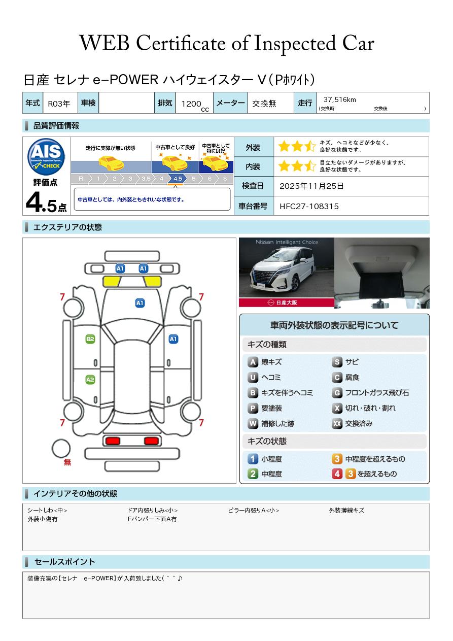 装備充実の【セレナ e-POWER】が入荷致しました(^^♪お支払い総額は大阪府内での基本お見積もりです。他府県登録も可能ですのでお気軽にお問い合わせください。
