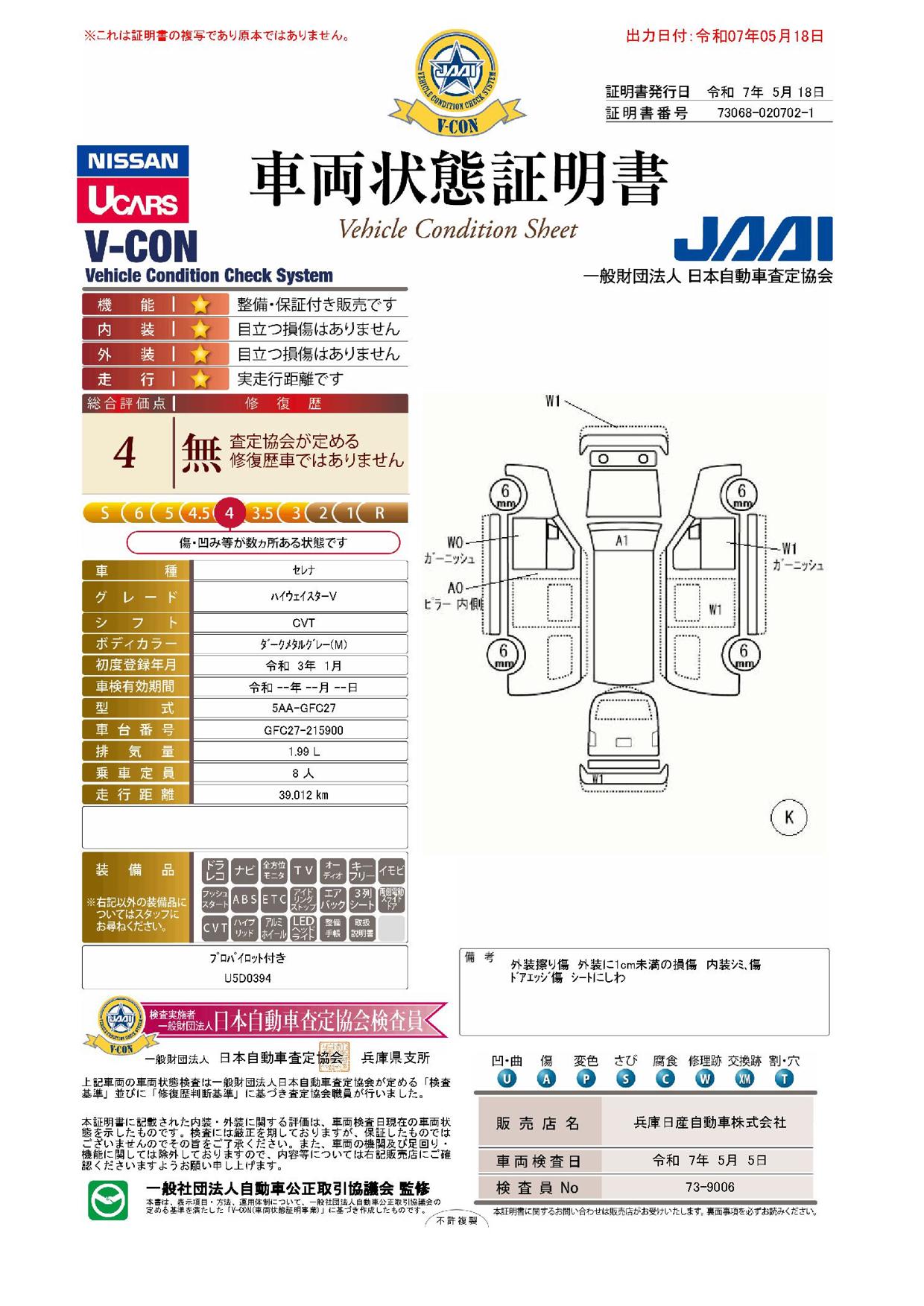 現状括弧書き内の年月まで車検有効期限が残っていますが、ご成約時に新しく車検を取り直します。なお取り直しの費用は車両価格に含まれています。
