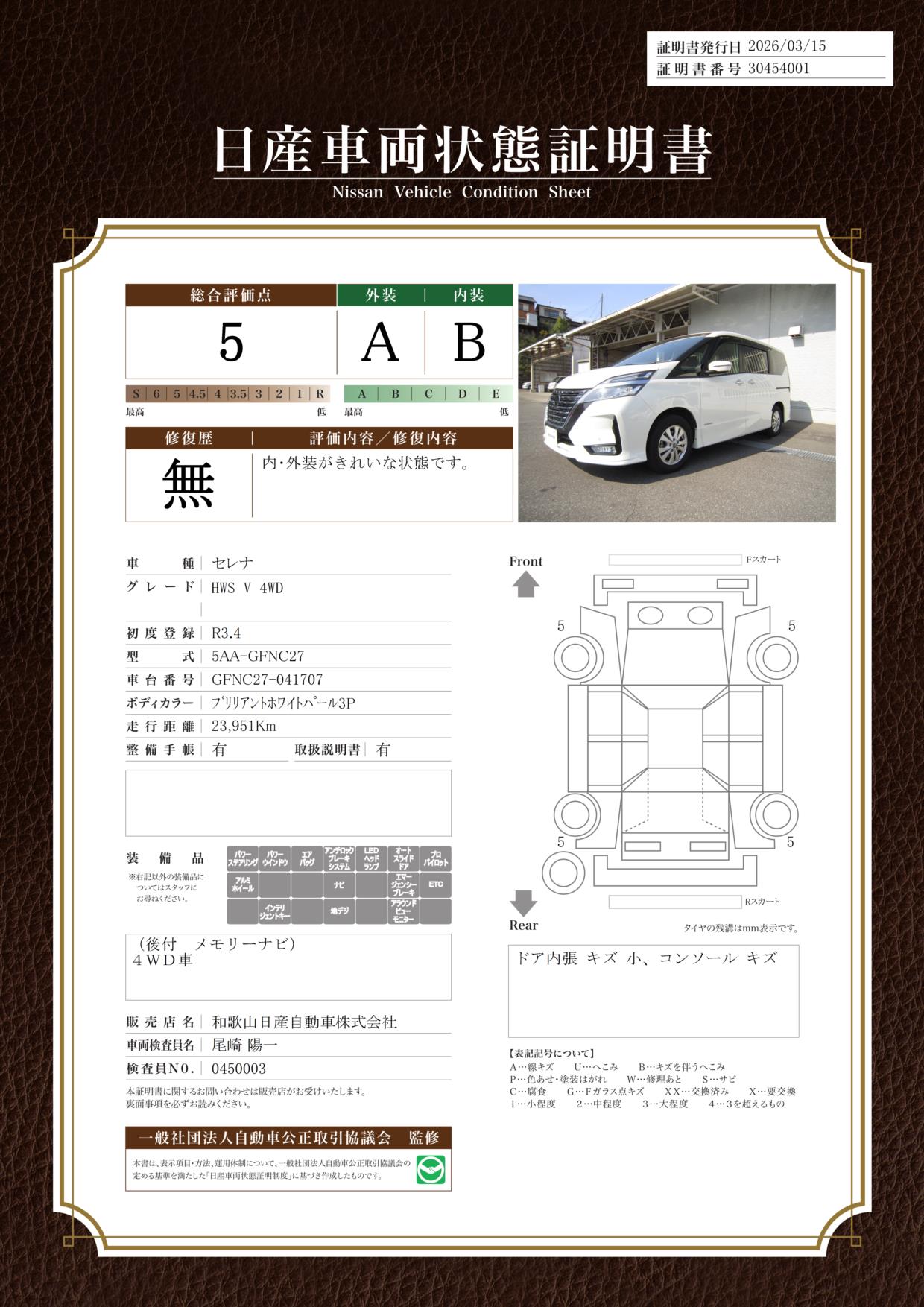 広々空間の4WD車、安全装備充実のセレナ入荷しました。お車の在庫、装備、傷の確認お問い合わせ無料 0078-6002-086373和歌山日産田辺マイカーまでご連絡下さい