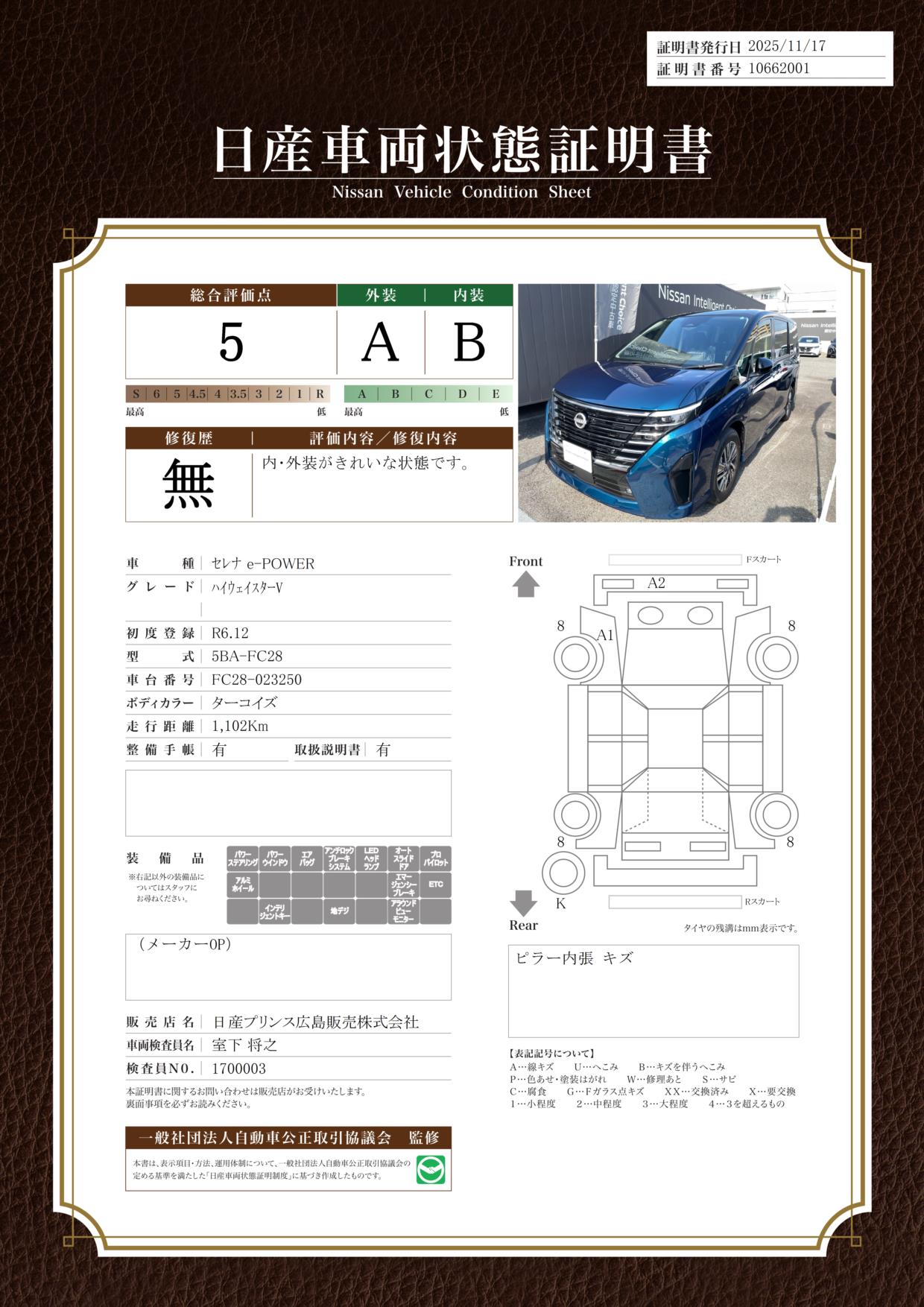 現状括弧書き内の年月まで車検有効期限が残っていますが、ご成約時に新しく車検を取り直します。なお取り直しの費用は車両価格に含まれています。