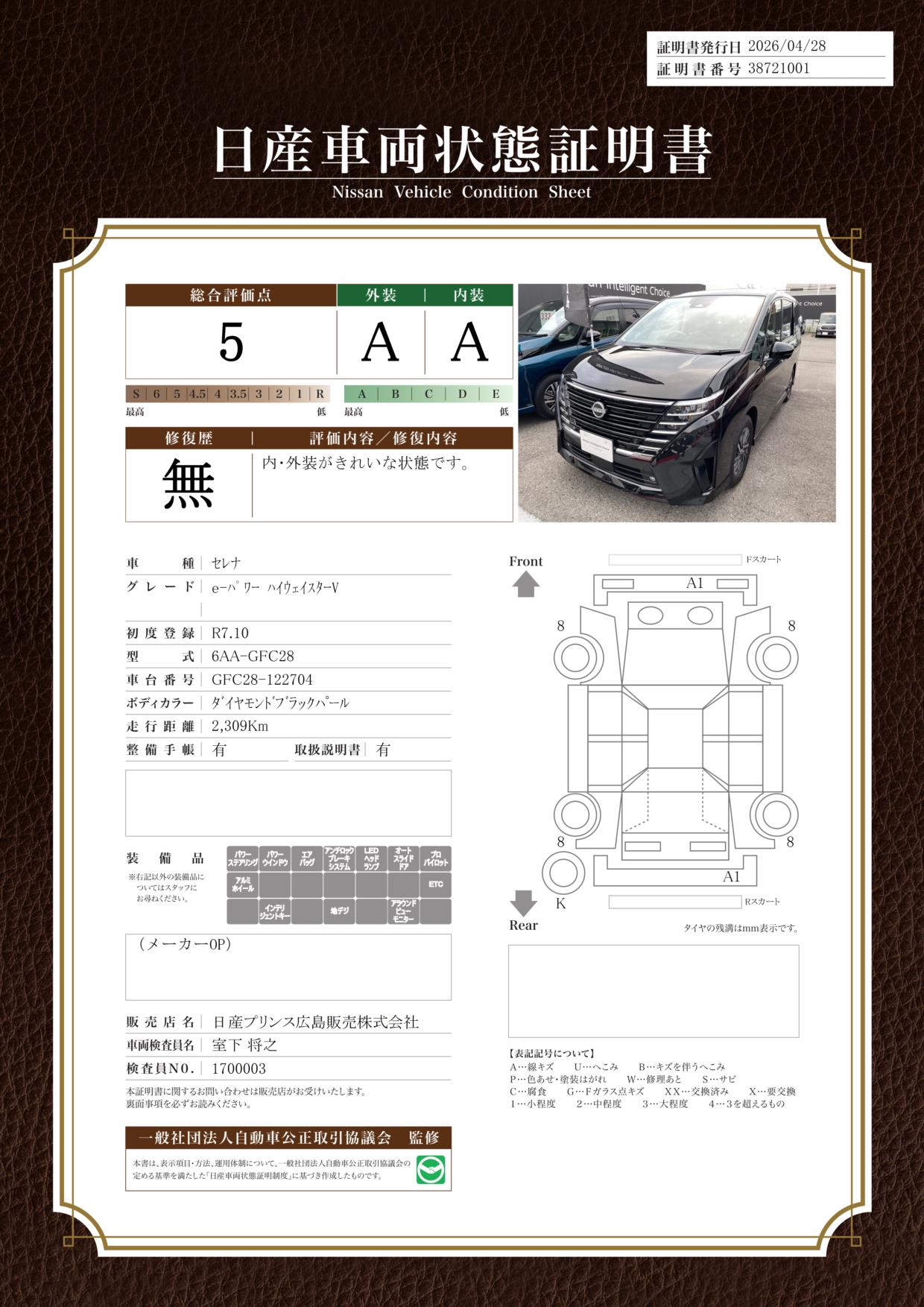 「車両状態証明書」は、査定協会監修のプロの検査員が公正かつ確かな基準で検査した”安心の証”です。