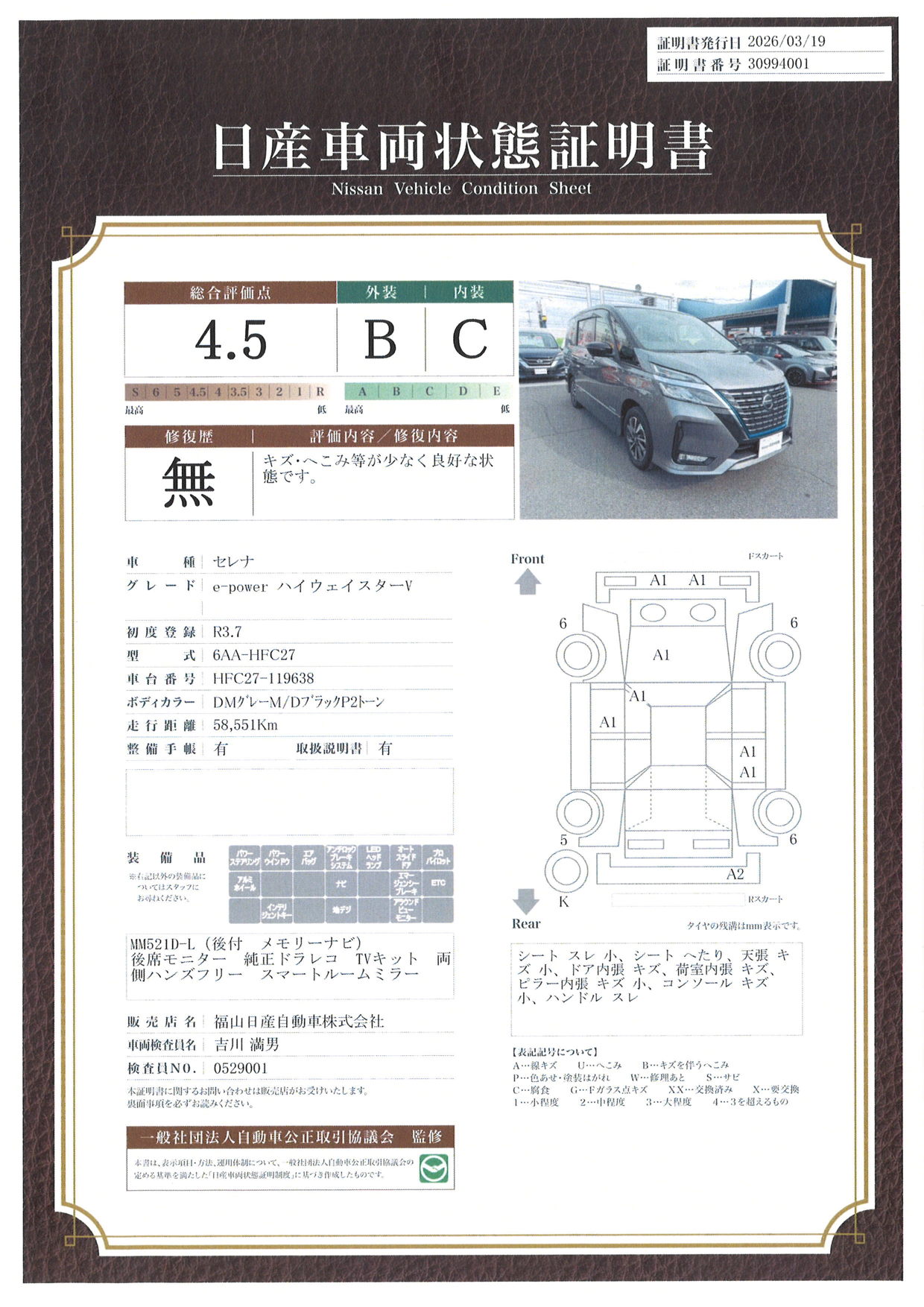 こちらのクルマは 「日産認定中古車」。 だから、4つの安心をお約束。