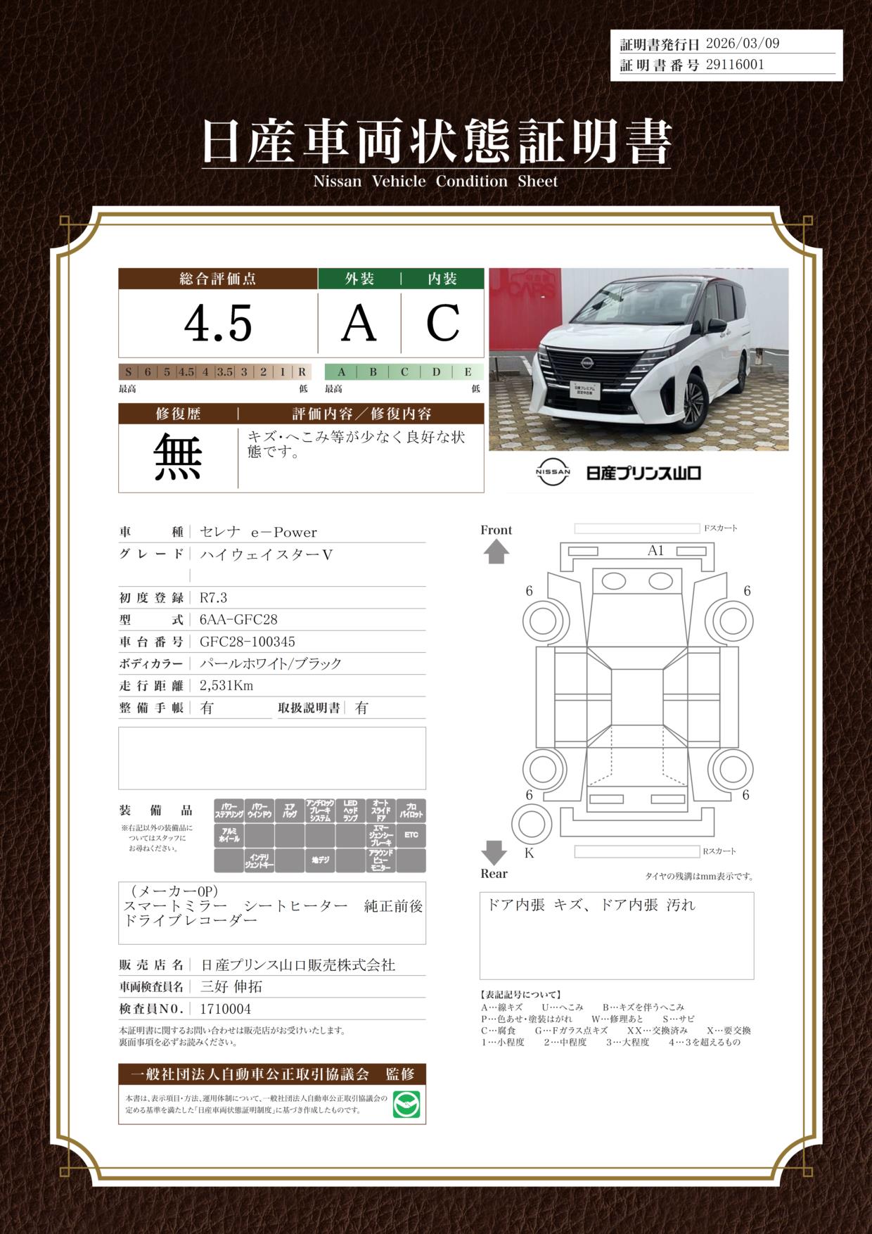 「車両状態証明書」は、査定協会監修のプロの検査員が公正かつ確かな基準で検査した”安心の証”です。
