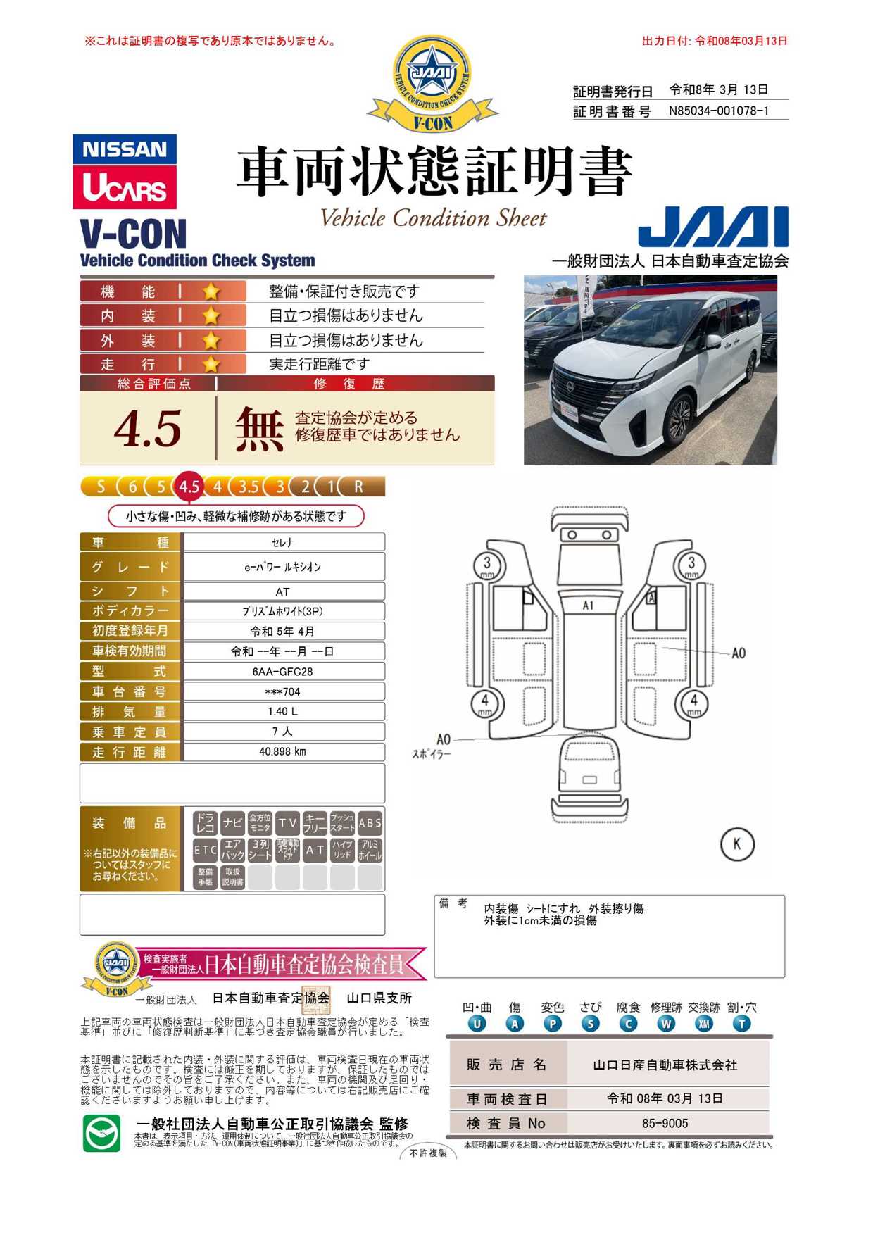 「車両状態証明書」は、査定協会監修のプロの検査員が公正かつ確かな基準で検査した”安心の証”です。