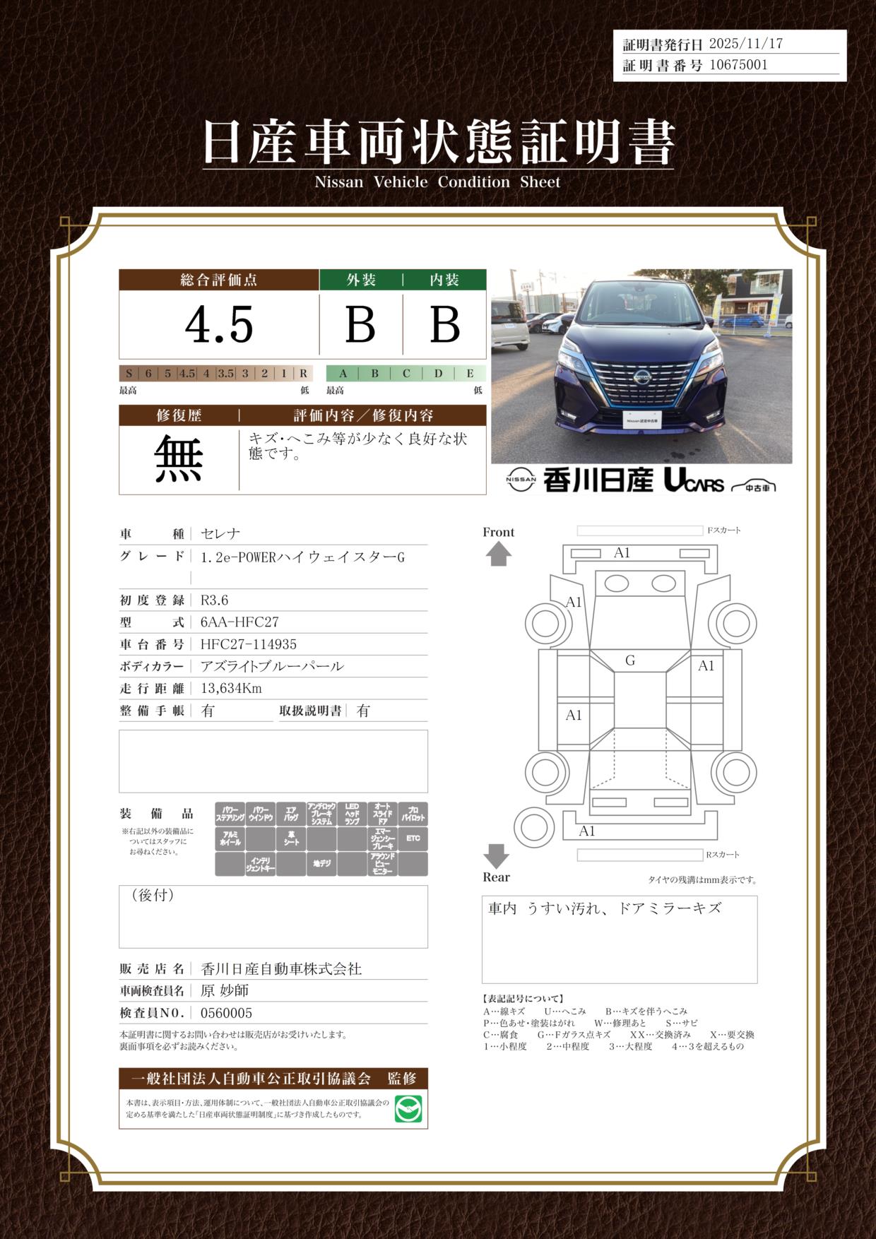 評価機関 : 日産車両状態証明