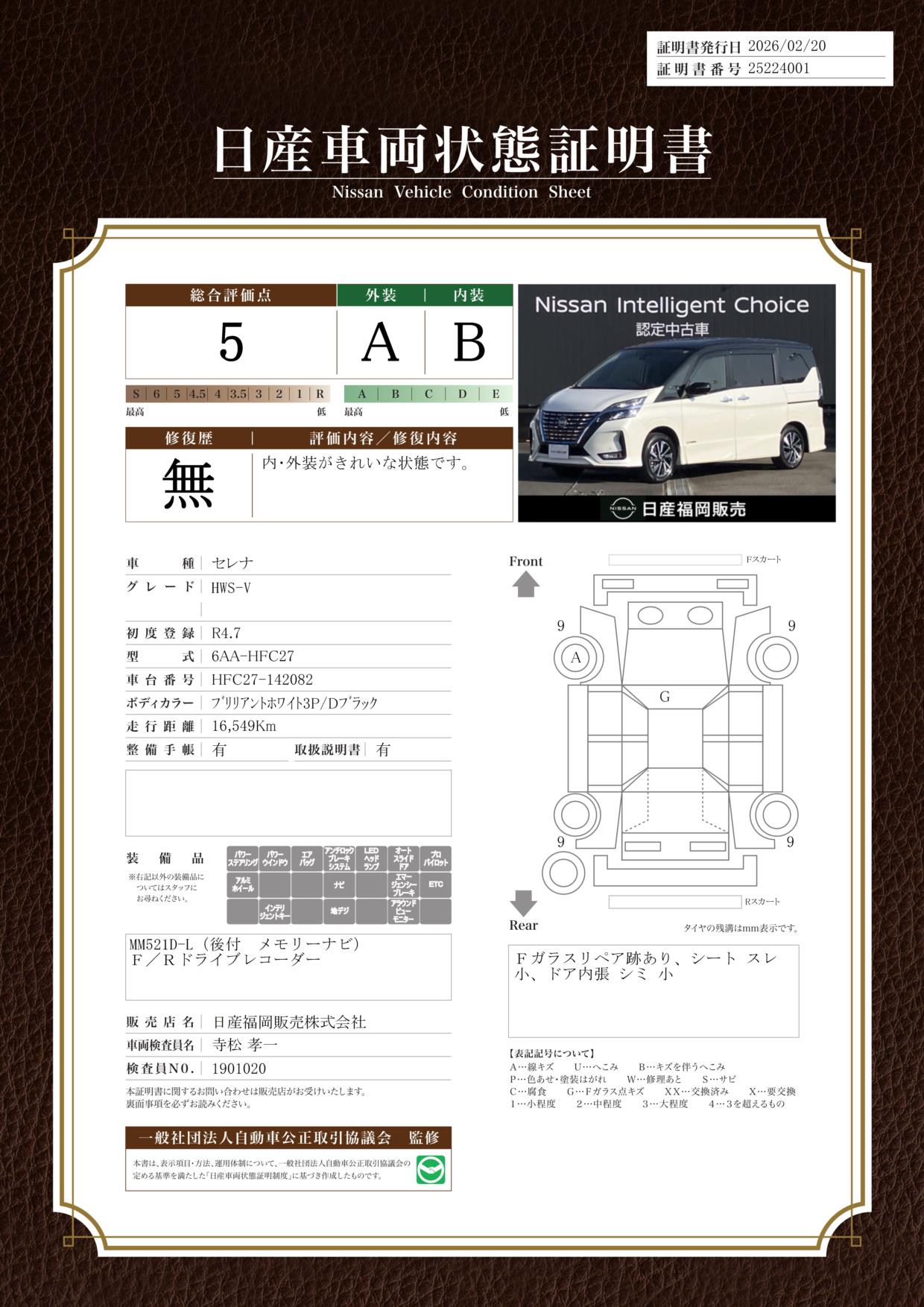 「車両状態証明書」は、査定協会監修のプロの検査員が公正かつ確かな基準で検査した”安心の証”です。