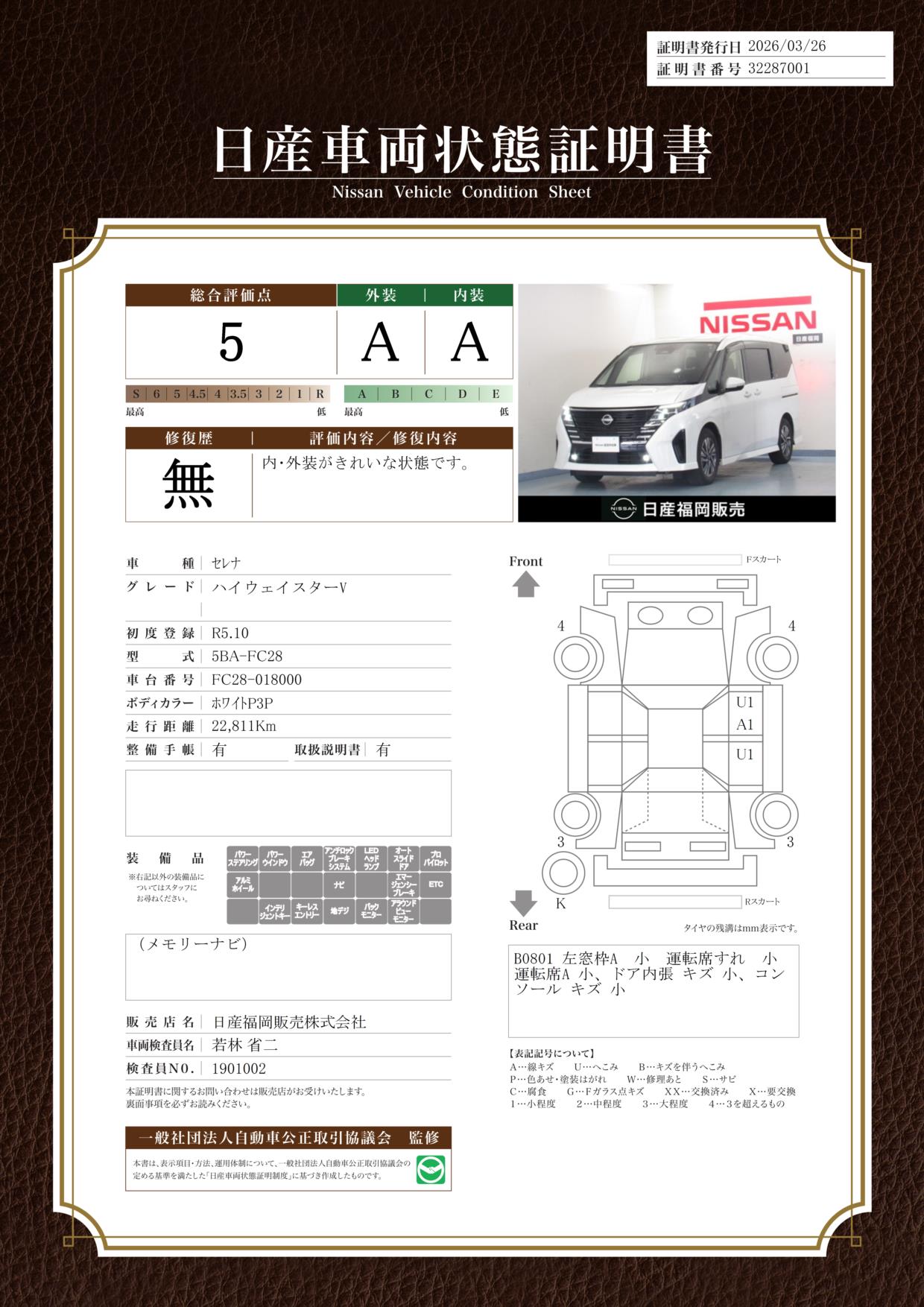「車両状態証明書」は、査定協会監修のプロの検査員が公正かつ確かな基準で検査した”安心の証”です。