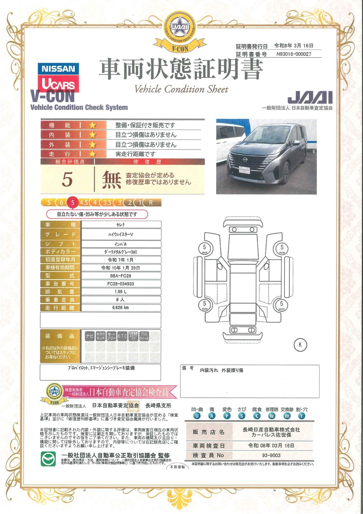 「車両状態証明書」は、査定協会監修のプロの検査員が公正かつ確かな基準で検査した”安心の証”です。