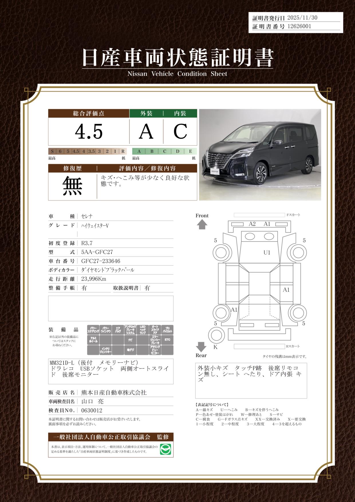 現状括弧書き内の年月まで車検有効期限が残っていますが、ご成約時に新しく車検を取り直します。なお取り直しの費用は車両価格に含まれています。