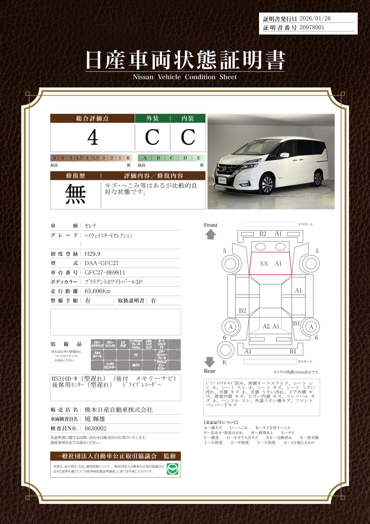 現状括弧書き内の年月まで車検有効期限が残っていますが、ご成約時に新しく車検を取り直します。なお取り直しの費用は車両価格に含まれています。