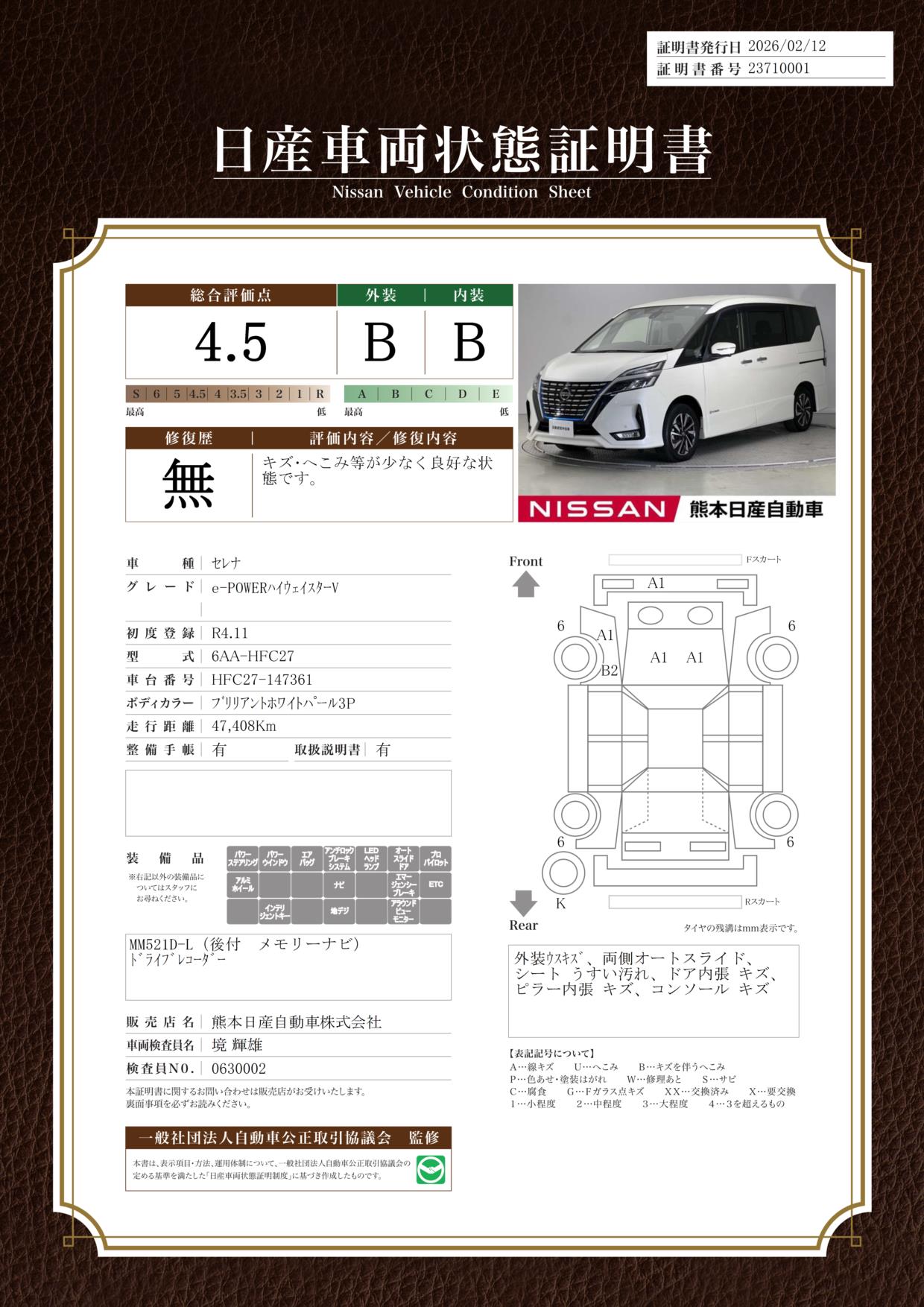 現状括弧書き内の年月まで車検有効期限が残っていますが、ご成約時に新しく車検を取り直します。なお取り直しの費用は車両価格に含まれています。