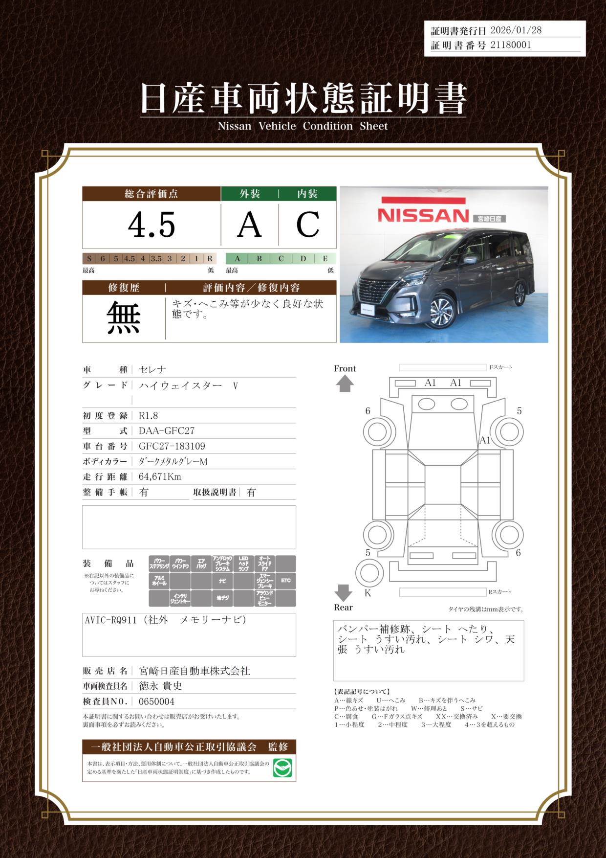 評価機関 : 日産車両状態証明