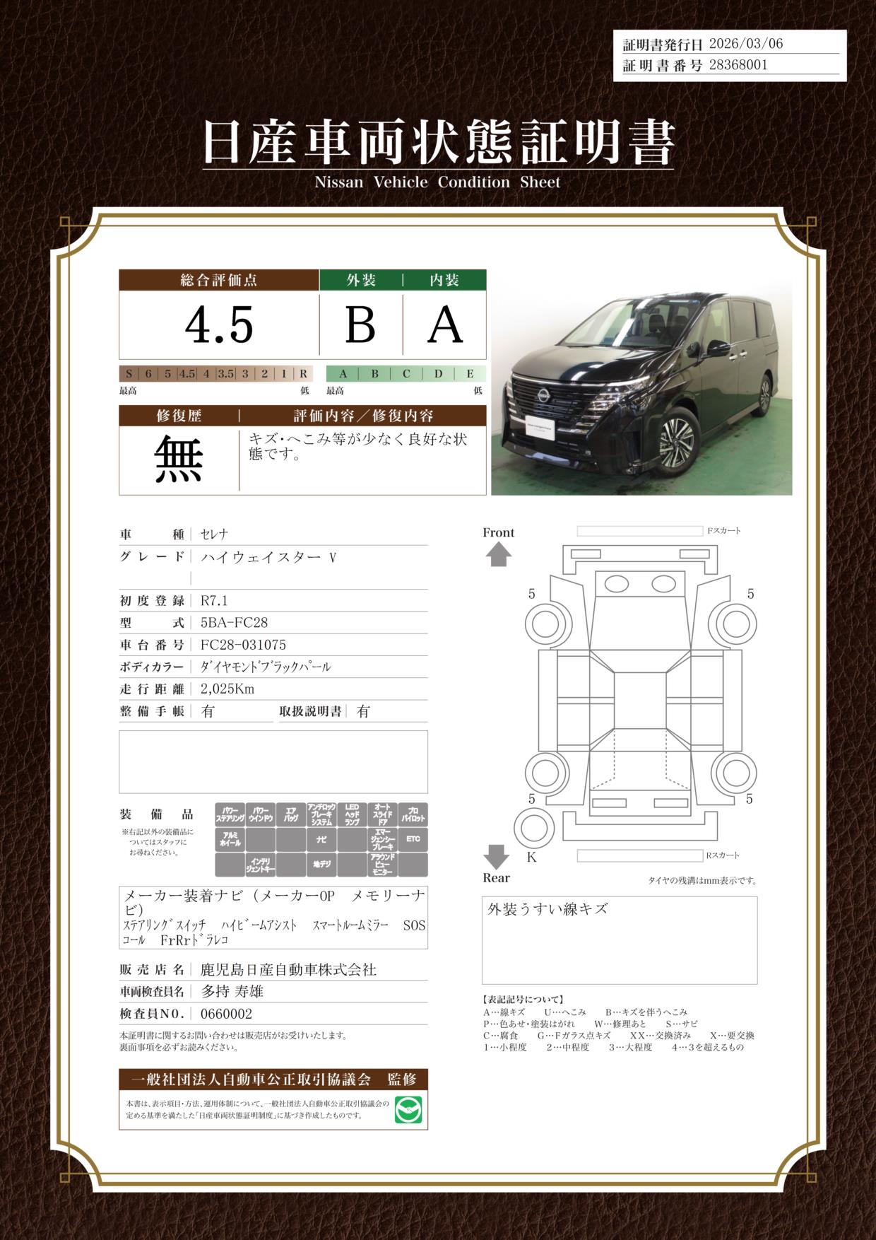 「車両状態証明書」は、査定協会監修のプロの検査員が公正かつ確かな基準で検査した”安心の証”です。