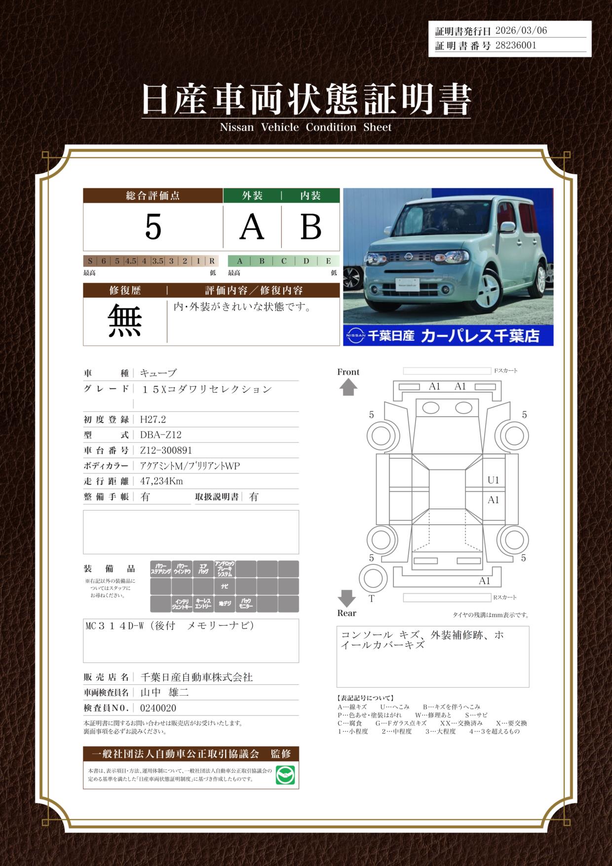 現状括弧書き内の年月まで車検有効期限が残っていますが、ご成約時に新しく車検を取り直します。なお取り直しの費用は車両価格に含まれています。